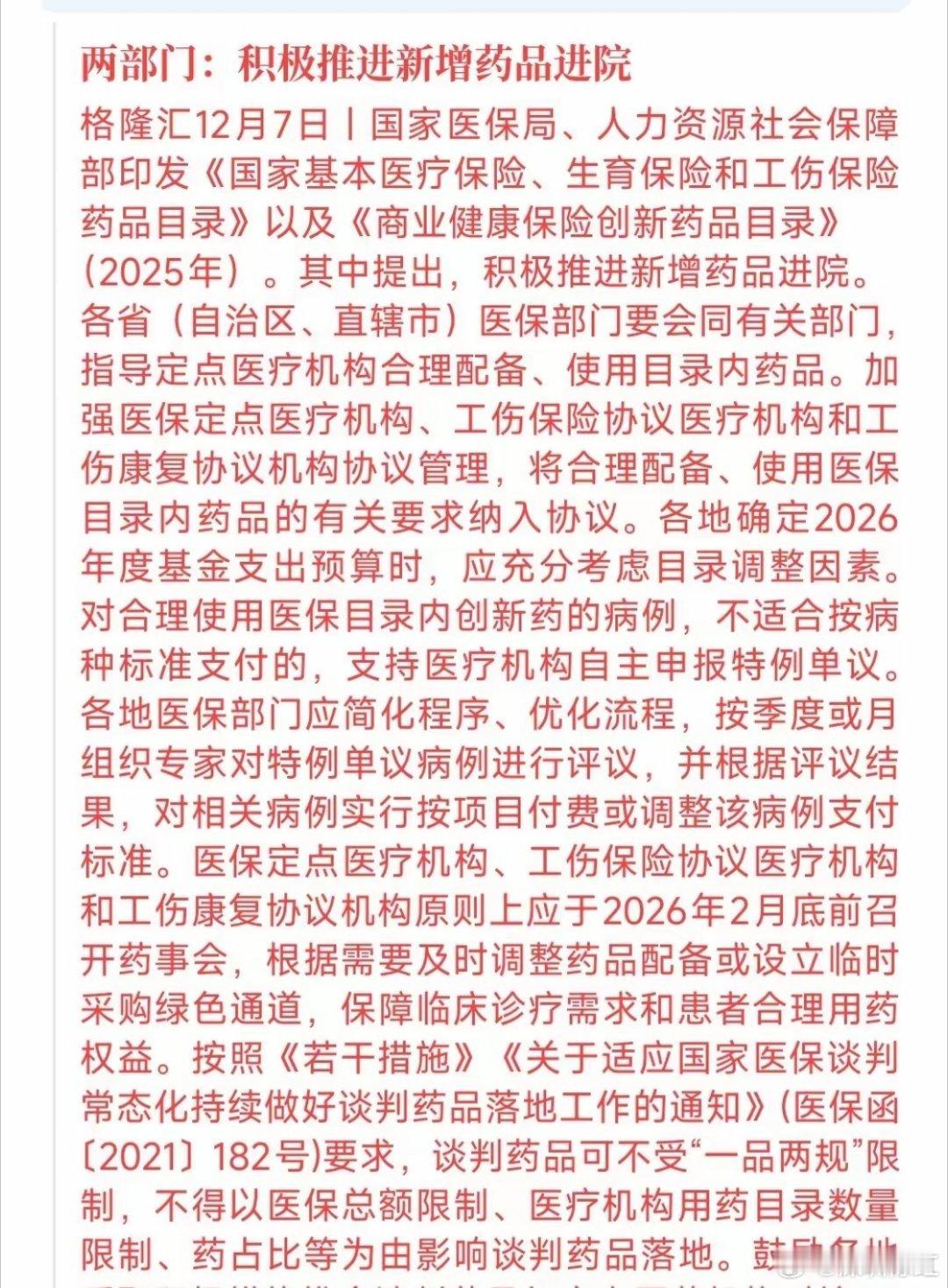 周末医药板块迎来重大利好,明天医药板块基本稳了2025年新版医保目录新增的114种药(含50种一类创新药)和首版商保创新药目录里的19种药能尽快进医院,尽早的能够让患者用上。对于114种药的厂商来说,这就是销量的提升,进了医院就是销量的保证,业绩当然也会随着提升。今年就是创新药的一年,上半年大力的政策扶持创新药的研发,下半年就已经能够让创新药进入商业化了,这对于患者和公司来说是双赢的局面。今年创新药板块基本已经翻倍了,进入商业化是最后一步,预计基本上已经打满了,短期内医药板块还有涨一波的可能。
