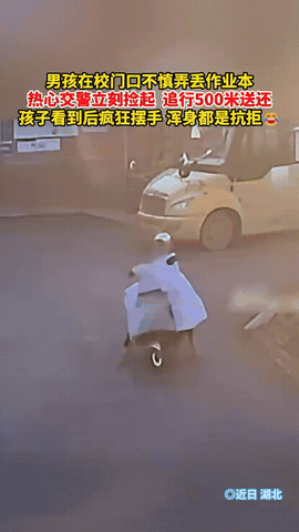 湖北,一名小学生放学出校门后,刚上妈妈的电动车离开,就不慎弄丢了一本作业。此时在旁边执勤的热心交警正好捡到了作业,但他正要把作业还给孩子时,母子俩已经驾车离开了,为此交警同志也是骑车追了500米将其送还。而作业还到孩子手上时,孩子略带哭腔的感谢,也是“感动”了不少网友。 放学时分的阳新街头,满是熙熙攘攘的人群,刚结束一天课程的小学生们,或是蹦蹦跳跳往家跑,或是乖乖坐上家长的车,有个小男孩也不例外,他扒着妈妈的电动车后座,正惬意地吹着晚风,享受着放学路上的轻松时光,完全没留意到手里攥着的作业本,已经悄无声息地滑落到了大马路上。 这一幕恰好被在校门口执勤的交警看得一清二楚,在成年人眼里,丢了作业本不过是件小事,可对学生来说,这关系到能不能完成作业、能不能顺利跟老师交差,更可能让家长跟着着急上火。 交警眼看着母子俩的电动车越骑越远,丝毫没察觉到作业本已经遗失,心里顿时就揪了起来,生怕孩子回家发现作业没了,不仅要挨家长说,第二天还没法向老师交代。 没多想这位交警立刻发动了自己的摩托车,朝着母子俩离开的方向追了上去,从校门口到追上电动车,足足有 500 米的距离,路上车来车往,交警一边注意着路况,一边加速追赶,那架势不知情的路人怕是还以为在上演什么 “警匪大片”,谁能想到,这场 “极速追击” 的目标,竟然是一本小小的作业本。 好不容易追上前方的电动车,交警一边放慢车速,一边朝着母子俩挥手示意,还大声喊着提醒他们掉了东西,可后座小男孩的反应,却成了整个事件的 “搞笑担当”。当他看清交警手里扬起的那本熟悉的作业本时,脸上没有半分失而复得的狂喜,反而写满了不敢置信,甚至还下意识摆着小手,那模样仿佛在确认 “这作业真是我的?”,浑身上下都透着一股抗拒,活脱脱像在说 “叔叔别追了,就让它留在路上吧”。 但交警可不会 “放过” 这本作业本,既然亲眼看到是孩子掉的,就必须完璧归赵,在交警的反复示意下,孩子的妈妈终于察觉到不对劲,慢慢把电动车靠边停了下来,随着距离拉近,那本承载着老师和家长期待、唯独不被孩子待见的作业本,还是被稳稳地递到了小男孩的手里。 也就在孩子接过作业本的那一刻,现场出现了最有戏剧性的一幕,只听小男孩扯着嗓子喊了一声 “谢谢叔叔”,可这声感谢里,却带着明显的哭腔,那委屈又无奈的调子,闻者 “伤心”,听者忍不住想笑。 估计孩子当时心里已经彻底崩塌了:本来以为运气爆棚,能借着作业本丢失逃过写作业的 “劫难”,结果被认真负责的警察叔叔硬生生给 “断了念想”,快乐瞬间消失得无影无踪。 这件事被路人拍下来传到网上后,评论区直接炸开了锅,网友们一边疯狂调侃小男孩那无奈摆手的模样和带泪的道谢,还脑补出他内心的崩溃独白,说这是 “史上最不情愿的失物认领”,另一边所有人都齐刷刷给这位狂奔 500 米送作业的交警点赞,夸他把群众的小事当成了自己的大事。 其实这本作业本本身不值什么钱,可在交警眼里群众的事没有小事。他或许不知道孩子心里藏着偷懒的小心思,但他清楚一本作业本关系到孩子的学业和家庭的安稳,要是真丢了家长孩子少不了要为这事烦心,那 500 米的追赶,追回来的不只是几页写作业的纸,更是交警那份把群众冷暖挂在心上的职业操守。