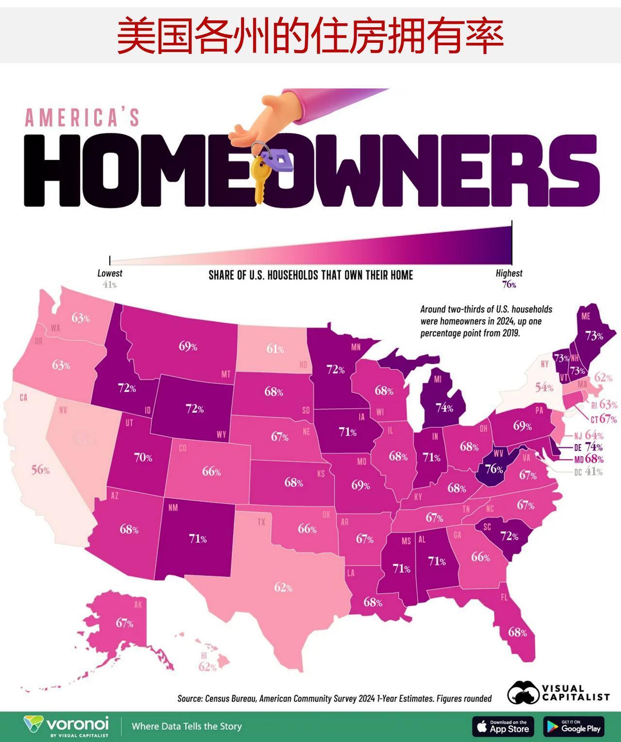 美国多少人拥有自己的住房,哪些州的住房拥有率高? 拥有房产是积累财富的传统途径,美国约三分之二的家庭属于此类。 在婴儿潮一代中,有近 60%的人在 33 岁时就已拥有住房,而如今这一比例已降至千禧一代的约 40%。如今,婴儿潮一代在各年龄段中仍拥有最大的房产份额,其比例比千禧一代高出约两倍。 这张图表展示了2024 年的美国各地的住房拥有率情况,数据来源于美国人口普查局。 西弗吉尼亚州在全美范围内处于领先地位,该州超过四分之三的居民拥有自己的住房。 西弗吉尼亚州以其经济实惠而闻名,到 2025 年,一个家庭只需收入 71000 美元就能买得起一套房子。此外,这指的是一个典型的三居室住宅,需支付 10%的首付款,并且房贷利率为 6.67%。 特拉华州位居第二,占比为 73.8%,而其他几个沿海的小型州也位列前十。 而在另一端,华盛顿特区只有 40.9% 的居民拥有房产,这一比例低于纽约(54.3%)和加利福尼亚(55.8%)。高昂的土地价格、严格的分区规定以及来自其他州的移民是导致该地区住房负担能力下降的关键因素。