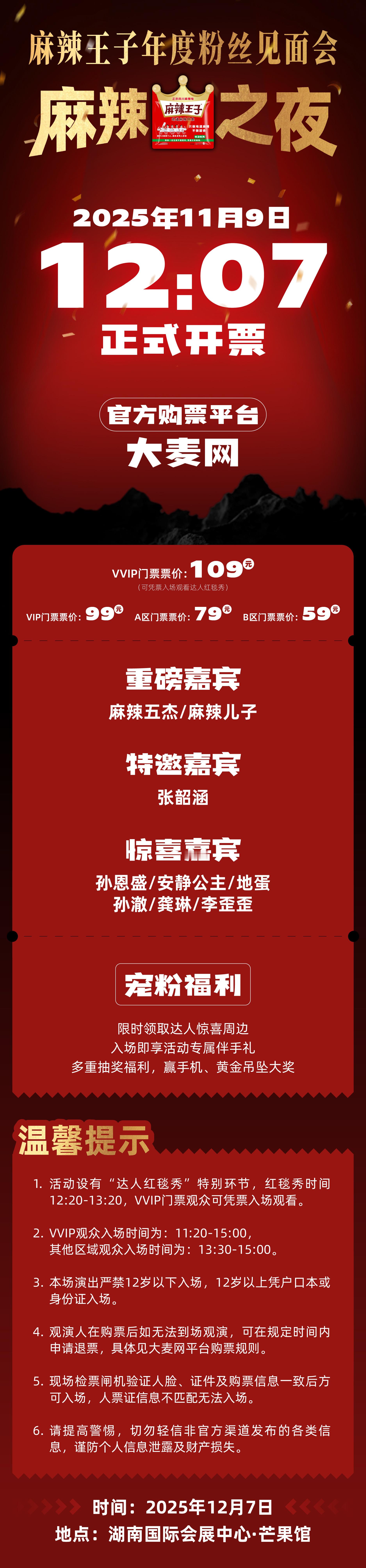 麻辣王子麻辣王子年度粉丝见面会 【2025年12月7日,与麻辣王子共赴一场热辣滚烫的浪漫之约】今晚,湖南国际会展中心·芒果馆灯火璀璨、人潮涌动——这里正上演着一场以“麻”为名、“辣”为魂的年度盛宴。舞台光影流转,空气中弥漫着熟悉的红油香与跃动的热情,每一包麻辣王子仿佛都跃跃欲试,在聚光灯下熠熠生辉。这不仅是一场万众期待的粉丝见面会,更是一次跨越味觉、记忆与情感的沉浸式奔赴——是对青春的回望,对热爱的礼赞,更是对无数个“我们”共同烟火日常的温柔致敬。——🌟 产品体验:从初见心动,到深陷热爱还记得第一次邂逅麻辣王子的瞬间吗?那抹跃然于包装之上的炽烈中国红,搭配跃动鲜活的明黄辣椒剪影,宛如一道视觉闪电,瞬间击中你的好奇心。指尖轻撕开密封包装的刹那,仿佛掀开了美食冒险的序章——扑面而来的复合椒香裹挟着醇厚酱香,直抵鼻尖;再看那根根红亮油润、纹理分明的辣条,色泽饱满如琥珀,光泽诱人似绸缎,食欲瞬间被彻底唤醒。入口一刻,是层次丰盈的味觉交响:前调是鲜辣奔放的川湘风骨,中段浮现温润回甘的豆香底韵,尾调则悄然升腾起一丝酥麻悠长的“上头感”,恰似湖南江湖的豪情与细腻并存。更妙的是那份独创的吃法灵感——冰镇汽水佐辣条,一口冰冽沁爽,一口热辣酣畅,冷与热、麻与辣在舌尖激烈共舞,竟碰撞出令人惊喜的味觉升华!而最动人的,永远是分享时刻:与家人围坐笑谈、与挚友勾肩搭背、与爱人相视而笑……那一包小小的辣条,悄然成了亲密关系里最朴实也最滚烫的情感信物。——🌈 与家人共度:一包辣条,盛满岁月温情那个周末傍晚,厨房飘着饭菜香,我悄悄把一包麻辣王子放在妈妈手边。她笑着拆开,咬下第一口,眼睛倏地一亮:“哎哟,这味道……好像又回到八十年代厂门口小卖部的味道啦!”窗外夕阳温柔洒落,她眼角细纹里漾着笑意,说话时还轻轻咂摸着余味。那一刻,辣味氤氲中升腾的,不只是舌尖的刺激,更是两代人之间无声流淌的默契与依恋——原来最浓的亲情,就藏在这微小却滚烫的共享时刻里。💑 与爱人的邂逅:一包辣条,写就心动伏笔那场雨后的咖啡馆约会,你忽然从包里掏出一包未拆封的麻辣王子,笑着说:“听说这是长沙年轻人的‘社交硬通货’。”我们并肩坐着,你递来半根,我接过时指尖微触,心跳漏了一拍。一起嚼着,辣意微灼,脸颊微热,你望着我笑,眼里有光,有试探,更有笃定。原来,有些喜欢,不必山盟海誓,它就藏在一包辣条分食的默契里,辣得真实,暖得绵长。👫 与朋友的分享:辣条作舟,载满青春航程谁没在大学宿舍熄灯后,压低声音传阅一包麻辣王子?谁没在KTV包厢里,边嘶吼边辣得直灌冰水还嚷着“再来一包”?谁没在毕业旅行的绿皮火车上,分着最后一包辣条,看窗外山河飞驰……它早已不是零食,而是我们青春的暗号、友谊的图腾、成长路上最鲜活的注脚——脆响一声,是年少无畏;辣出眼泪,是肆意张扬;分食一包,是此生不换。📸 实拍图分享:镜头定格,皆是心动瞬间手机相册里,有深夜书桌前独自咀嚼时专注的侧脸;有年夜饭桌上,奶奶夹起一根辣条放进我碗里的慈爱特写;有闺蜜聚会时高举辣条自拍的搞怪九宫格;更有今晚芒果馆现场,灯光下挥舞荧光棒、笑容灿烂如焰火的万人同框……每一帧画面,都是麻辣王子写给我们的一封“生活情书”。💖 这就是我与麻辣王子的故事——不宏大,却足够真实;不喧哗,却始终滚烫。它用一包辣条的尺度,丈量过我的童年、青春与热爱;也用一味麻辣的浓度,调和着生活的咸淡与悲欢。愿每一个打开它的你,都能咬下属于自己的那一口热烈、一份真诚、一段不可复制的独家记忆。今夜,麻辣之夜,我们不见不散。