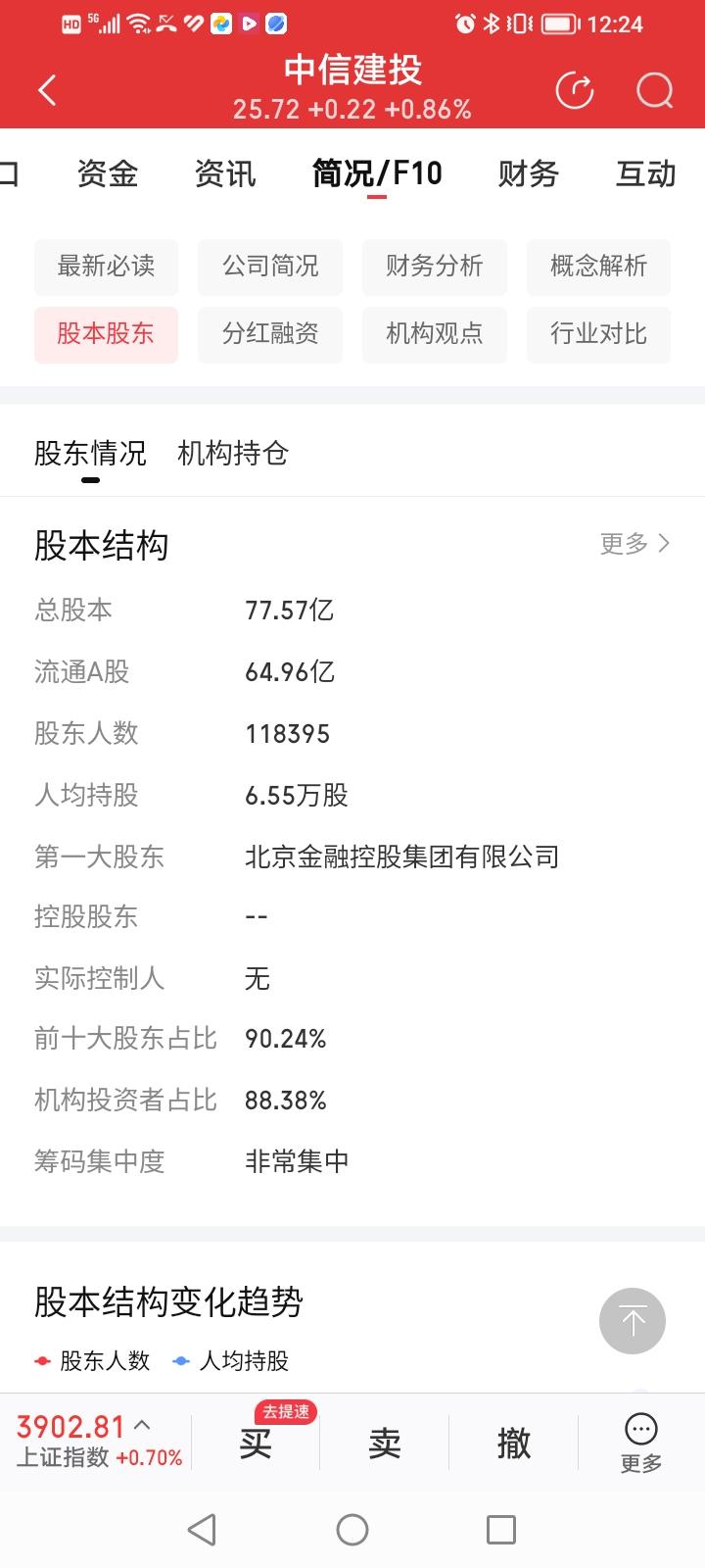 中信建投底部六连阳,这个走势不寻常!中信建投先于大盘止跌,并逆势上涨率先站上年线后强势不改,透露了大资金异动的强烈信号。 这正如钓鱼一样,大鱼已经咬钩但还未露头,虽然有水花,但还不知道鱼有多大,等到它一根阳线拔地而起时,才算鱼露头了。 中信建投作为市值1900多亿的市值老三的头部券商股,前十大股东持股占比高达90.24%,汇金公司是第二大股东,持股占比30%以上,是否会上演什么购并重组题材的大戏呢?