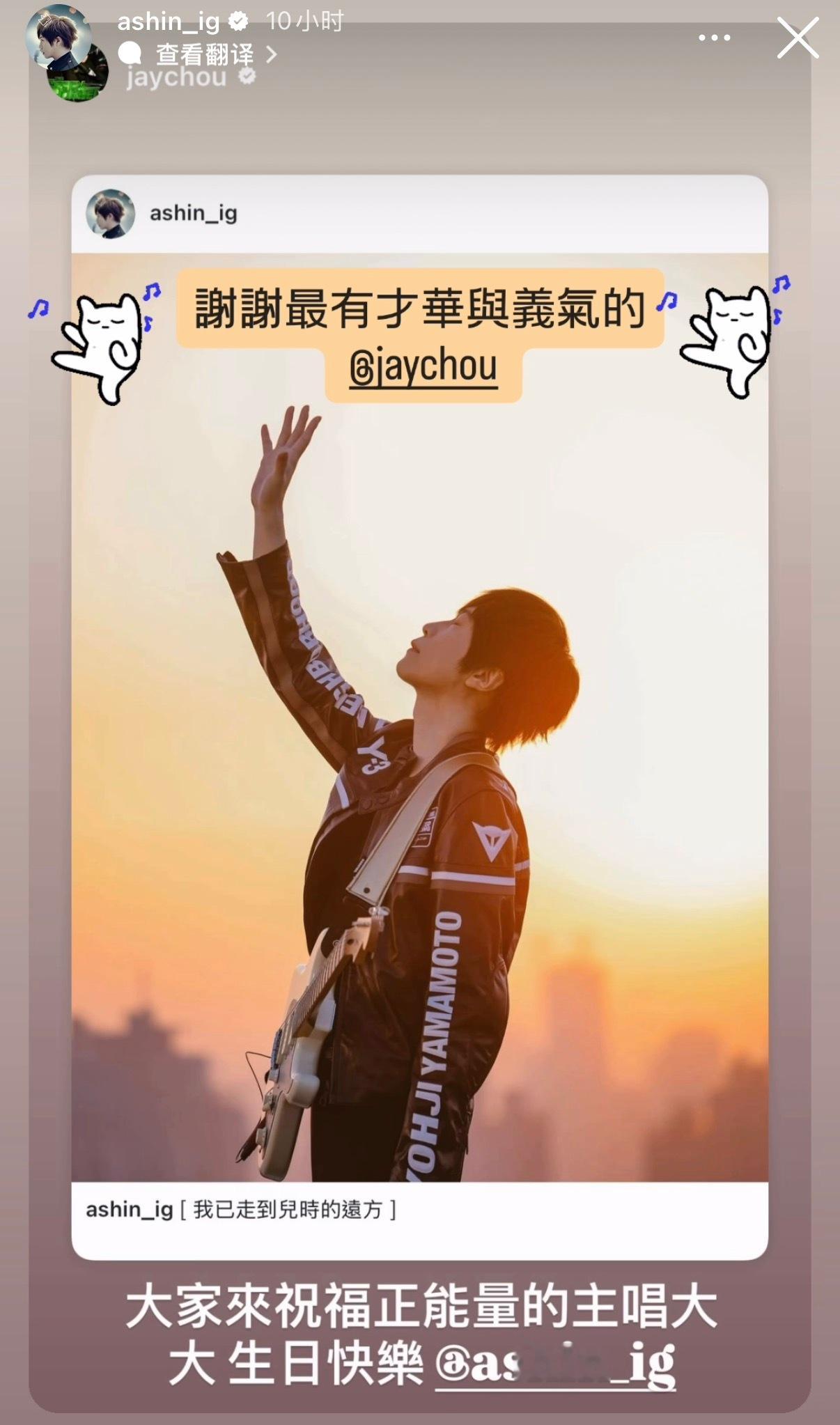 杰伦:大家来祝福正能量的主唱大大 生日快乐阿信:谢谢最有才华与义气的@ jaychou