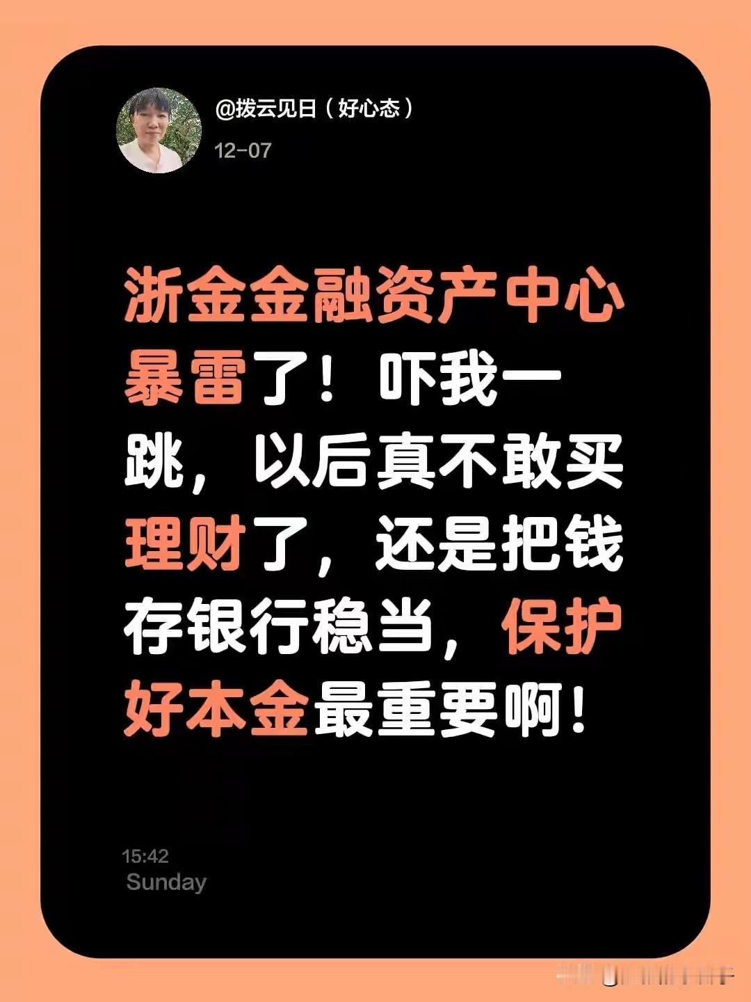 我要你的利息,你要我的本金! 防不胜防,这个世界就是这样,你不贪心就永远没有人能骗的了你。 当然你也没办法赚到钱,所以浙金中心这次,让很多人再一次对理财这个话题有所认识,以后还是别想赚利息这一说了。 买基金和放在股市都比这个理财好。