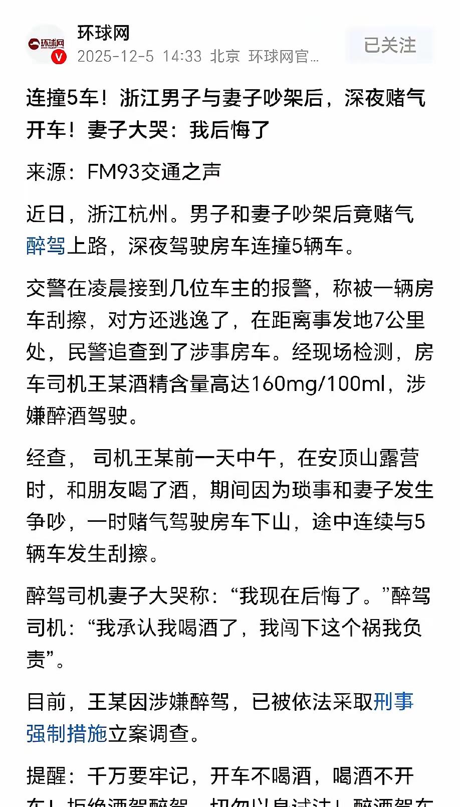 这是一起因酒后驾驶而引发的严重交通事故,展现了酒驾的极端危险性和法律后果。事件经过主要包括以下几个方面: 事件背景: 时间:露营当天夜晚 地点:浙江杭州安顶山 人物:男子王某、妻子以及几位朋友 事发经过:饭桌上妻子因琐事数落王某,夫妻争吵激烈。王某心烦意乱,赌气驾驶房车发泄,结果酒后驾驶造成车辆连撞多辆,且肇事后逃逸。 行为细节: 由于妻子和朋友的目睹,现场氛围尴尬。妻子与夫因争吵升级,影响了聚会气氛。 王某酒后情绪激动,未与家人或朋友告别,擅自驾驶房车下山发泄。 在行驶中,连续撞击5辆其他车辆,且未停车处理。 事发后果: 被公安机关拦查时,酒精检测值高达160mg/100ml,远超醉驾认定标准(80mg/100ml)。 王某坦白承认喝酒和肇事,表现出无悔之意。 其他车辆受损,相关维修费用由肇事人承担,但保险公司依法不赔偿,因为酒后驾驶属于免责范围。 王某因涉嫌危险驾驶罪被刑拘,面临行政和刑事处罚。 法律分析: 根据《刑法》第一百三十三条,醉酒驾驶机动车且血液酒精含量超过80mg/100ml即构成危险驾驶罪。 王某驾驶时酒精含量达到160mg/100ml,明显符合醉驾的认定。 在道德和法律层面,醉驾不仅危害自身,还严重威胁他人安全。 逃逸行径加重了刑事责任,依法应处以拘役和罚金,同时承担所有受损财产的赔偿责任。 教训与启示: 一场简单的家庭聚会因琐事引发冲突,最终酿成刑事案件,说明情绪管理和理性应对的重要性。 酒后驾驶的危害巨大,无论何时都不能忽视酒精对驾驶能力的影响。 法律对醉驾的打击坚决,违法者将面临严厉制裁。 个人冲动行为可能带来无法挽回的严重后果,应以此为戒,珍惜生命与安全。 总结:这起事件充分体现了酒驾的危险性与严重性,也是法律对交通安全的严格维护。希望公众引以为戒,遵守交通法规,杜绝酒后驾车,保障自己和他人的生命财产安全。醉驾驾驶电动车 驾驶事故