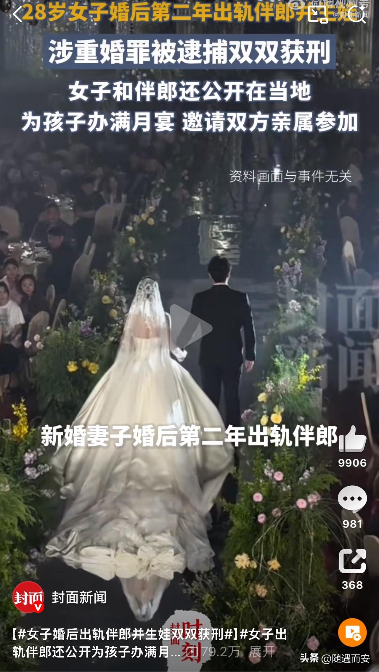 陕西省柞水县的何女士今年28岁,2019年12月19日与程先生结婚。二人举办婚礼时,邀请郑先生担任伴郎。结婚后程先生经常外出打工,婚后第二年,何女士和郑先生便开始对外以夫妻名义共同生活,并于2022年12月4日生育一名男婴。 何女士在医院分娩期间,郑先生以配偶、夫妻身份签署委托书、患者知情同意书等材料。2023年2月15日,二人还公开为孩子举办满月宴,邀请双方亲属参加。 法院判决,何女士犯重婚罪,判处有期徒刑一年,缓刑二年;郑先生犯重婚罪,判处有期徒刑十个月。 不但这个女人和伴郎厚颜无耻,双方亲属也够毫无羞耻,明知道他俩出轨,还参加孩子的满月宴。 婚姻不是儿戏,忠诚是法定义务而非选择题,任何突破底线的“感情自由”,终将付出刑事追责的沉重代价。 婚姻的根基是责任与敬畏,既要遵守法律底线,更要坚守道德准则。