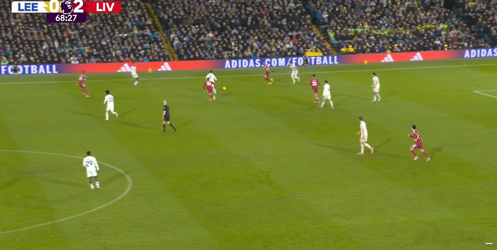 利兹联其实这场不算完全体,这一点看我写的踢切尔西那场即可。双中锋后还需要田中碧。不过,法尔克换上田中碧,这场确实是扭转了比赛。可以看68分回合,田中碧洞里接球反击。看那个时候赫拉芬贝赫、琼斯和麦卡的位置。再看一分钟后,利物浦右侧肋部的巨大空挡。科耐特最后横移十几米滑铲被造点。这里其实跟中场布置,尤其是琼斯的要求关系很大,站位一度非常混乱。但这确实不是斯洛特很擅长的东西。索博这场进球,但我不是很觉得在当下,让索博踢边非常适合。更像是弥补萨拉赫跑动的举措,但这样其实没有最大化索博在中路的覆盖,反而边路防守索博很容易吃对面动作。但有的东西就是类似情绪,最终蔓延到具体的细节动作上,第二个丢球和第三个都是如此。