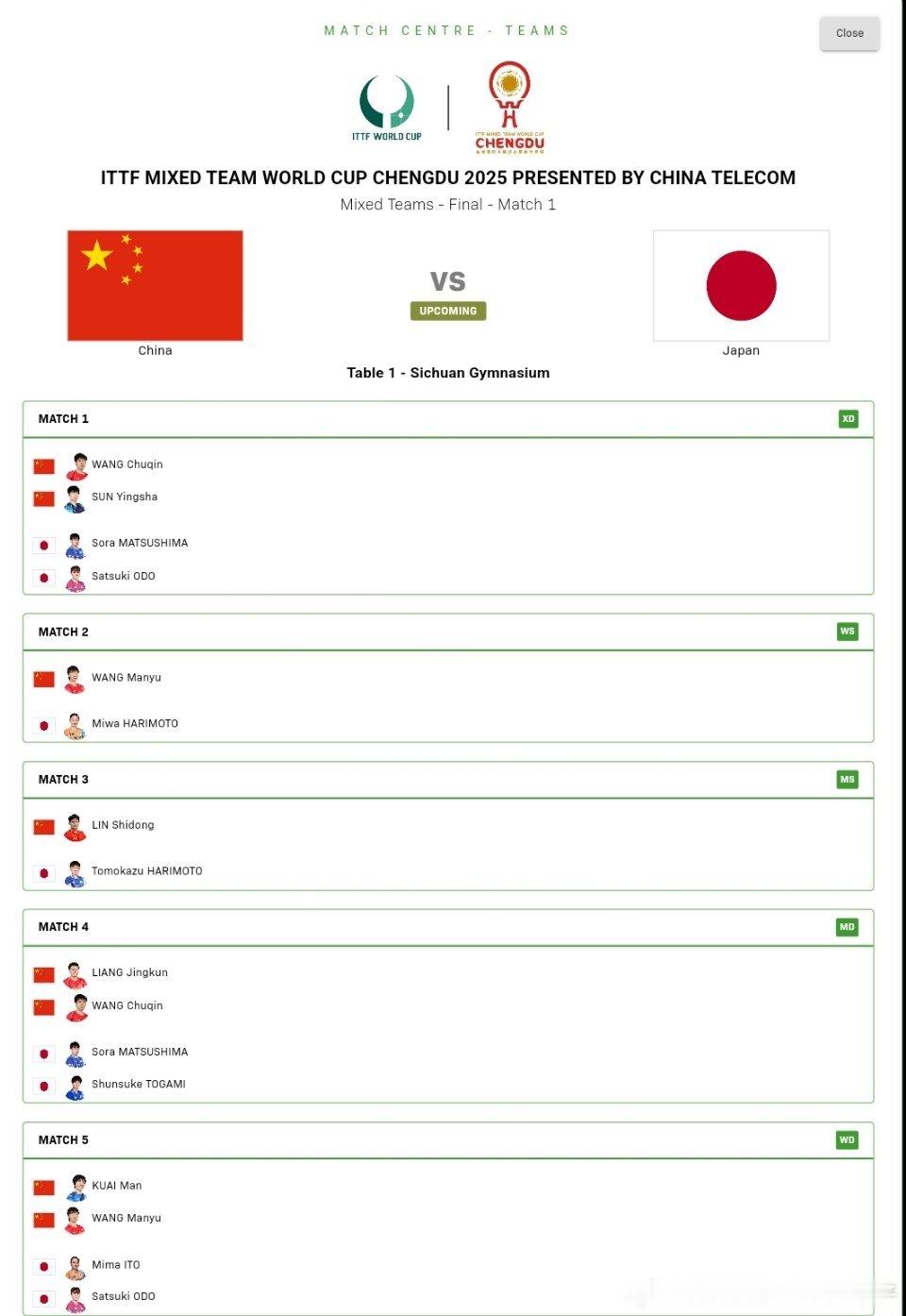 2025年国际乒联成都混合团体世界杯决赛对阵表:中国队🇨🇳VS日本队🇯🇵王楚钦孙颖莎VS松岛辉空大藤沙月王曼昱VS张本美和林诗栋VS张本智和梁靖崑王楚钦VS松岛辉空户上隼辅王曼昱蒯曼VS伊藤美诚大藤沙月