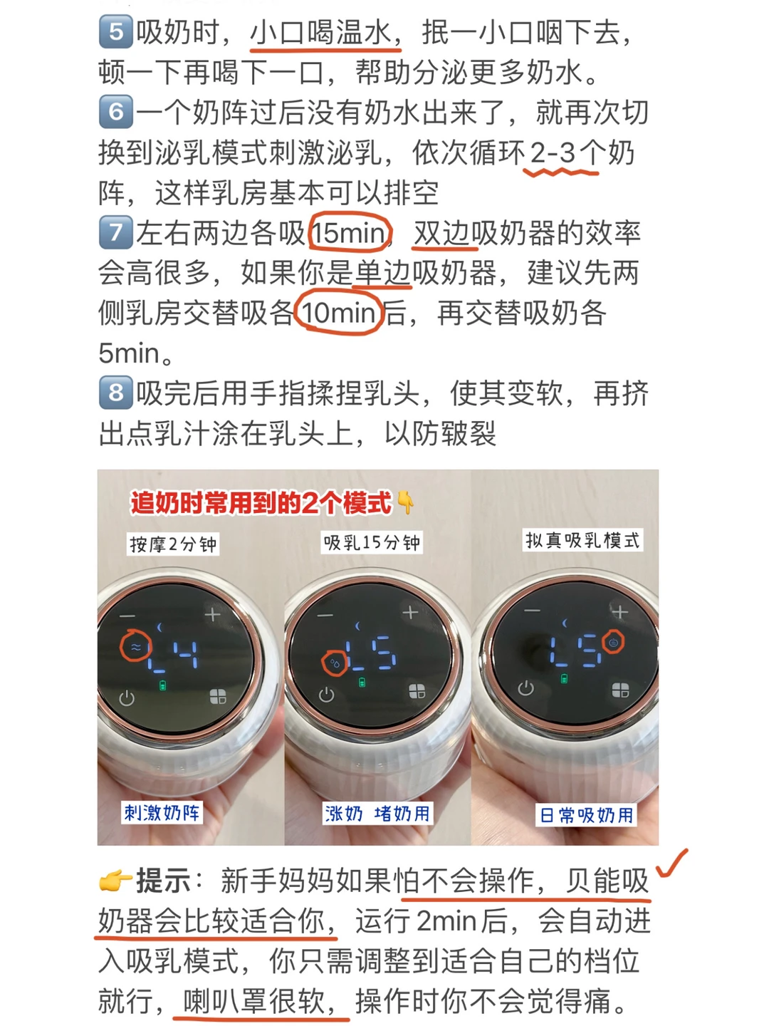 🔹提示:市面上的吸奶器很多,新手妈妈不知道怎么选的话,可以试试👉贝能三合一吸奶器,以上的标准它都符合了,每个模式都有9个档位,它还有个牵引模式,对乳头凹陷的妈妈特别友好。而且一机三用,可以单双边切换,也可切换成手持模式,适用场景多,无论什么情况都能满足妈妈需求。