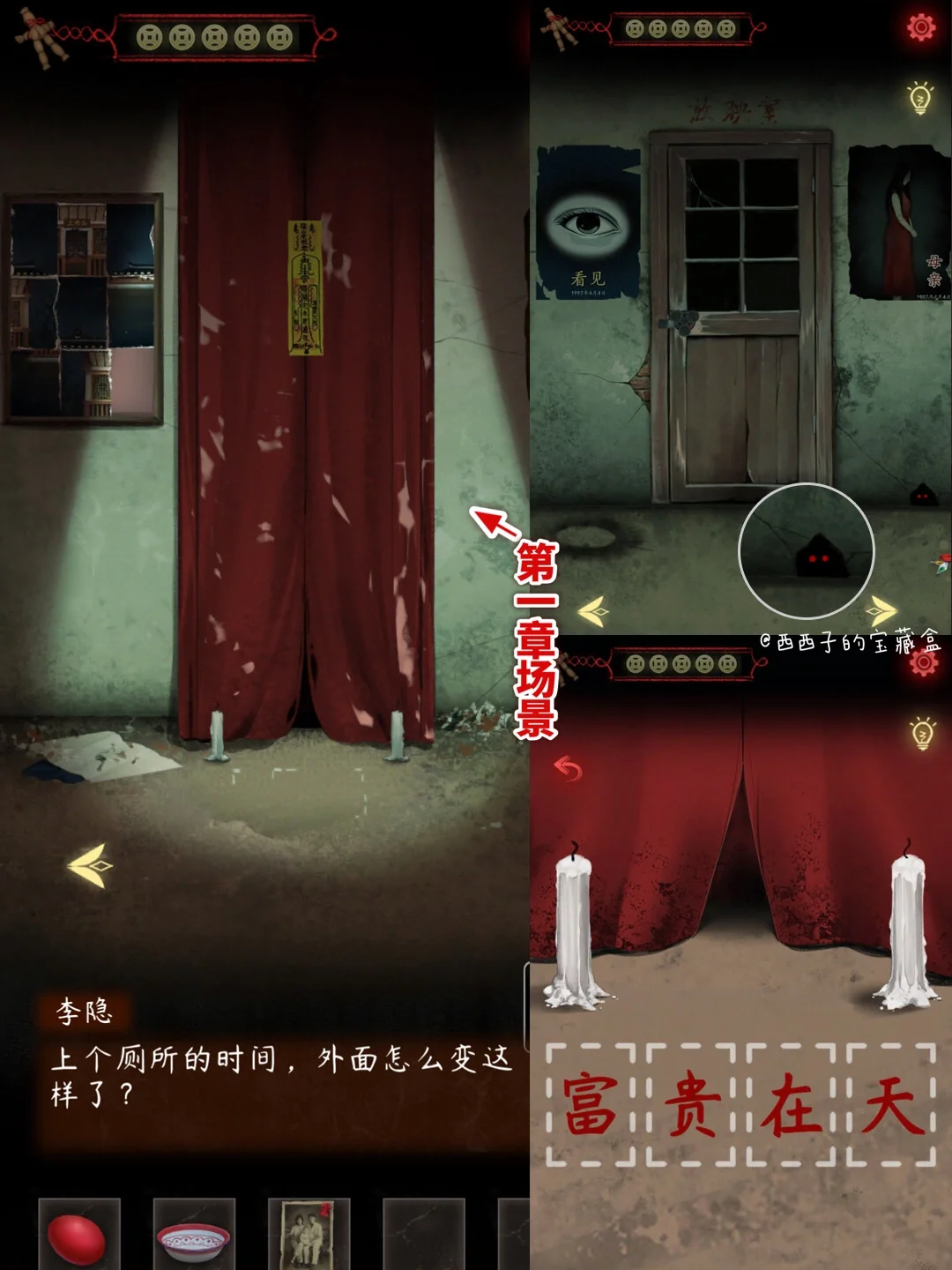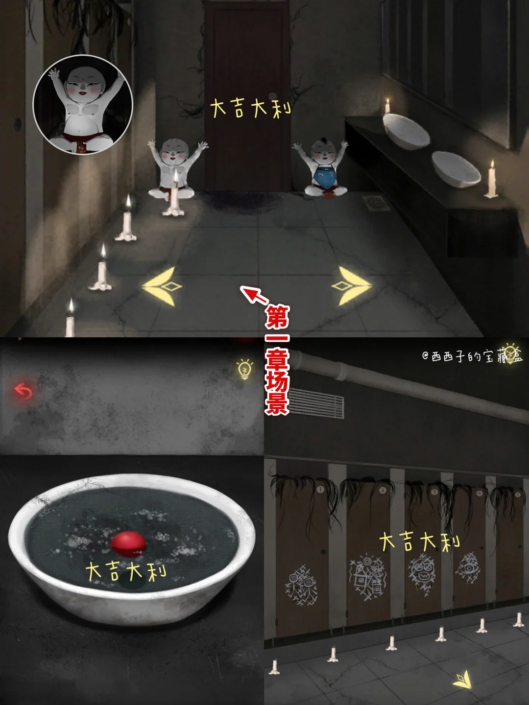 想办法把门打开后,发现大门被锁了,门口还有一把驱邪的糯米,后面根据游戏提示把厕所的🕯️蜡烛点燃,厕所的灯会熄灭,这时候整个环境突然变的很破旧,门口还出现了两个🧒童子娃娃,两边一排蜡烛,画面就有点慎人了~