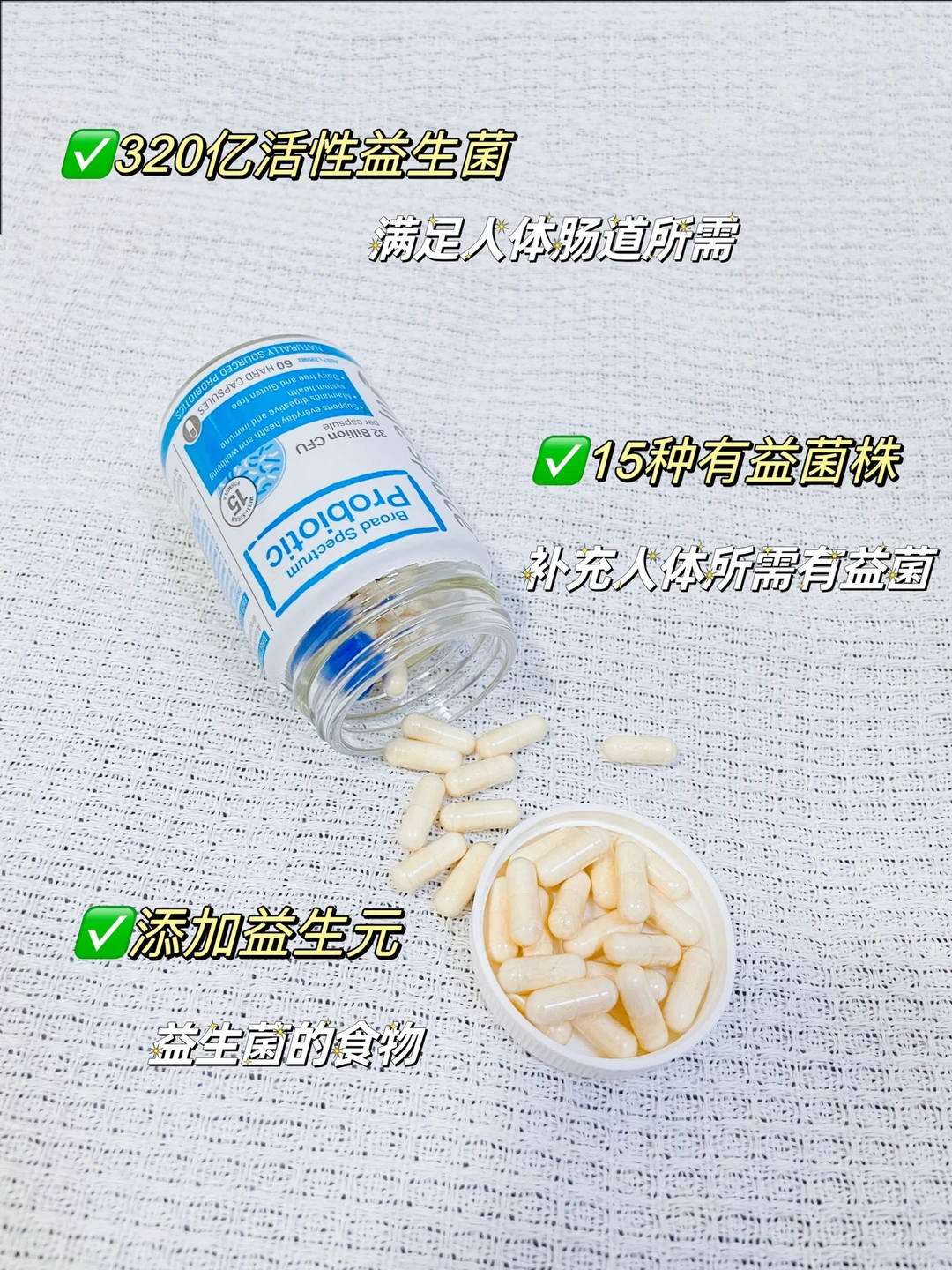 ❤️每颗胶囊都含有320亿高活性益生菌,满足人体一天所需,胶囊还是Drcaps肠溶胶囊,在胃部2小时溶解率小于10%,所以可以帮助益生菌或者抵达肠道。还添加了益生元,这个就是益生菌的食物,让益生菌活力满满~[赞R]我平常都是餐后半小时左右温水送服。