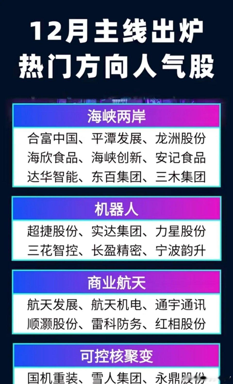 12月四大热门板块之一:题材驱动为主,聚焦情绪与业绩共振机会12月A股市场题材炒作热度升温,海峡两岸、机器人、商业航天、可控核聚变四大板块成为资金短期聚焦的核心方向。相关标的多绑定热门概念,依托政策预期或行业动态实现情绪溢价,但多数个股需依赖题材热度维系关注度,部分存在“主业与概念关联度低、业绩支撑薄弱”的问题,整体伴随较高波动风险,需理性甄别投资价值。一、海峡两岸板块:政策预期催化,区域协同成核心看点依托区域政策红利与合作预期,海峡两岸板块标的覆盖医疗、消费、基建、信息化等多领域,福建本地企业成为核心阵营:合富中国:海峡两岸+医疗双概念人气股,绑定闽台医疗合作预期,此前走势强势。但主业医疗流通的区域业务占比仍需提升,短期以题材催化为主,核心关注两岸医疗合作的实际落地进展。平潭发展:平潭综合实验区唯一上市平台,板块核心标的,政策催化下土地开发、基建业务预期升温。但公司主业多元,需跟踪基建项目落地对业绩的实质拉动效果。龙洲股份:海峡两岸+卫星导航双概念叠加,短期走势活跃。主业聚焦交通运输,概念相关业务占比低,属于题材联动型标的,需警惕热度退潮后的回调风险。海欣食品:福建本地食品龙头,海峡两岸+消费概念,供货沙县小吃等核心渠道。区域消费需求提升带动关注度,但食品行业竞争激烈,需重点跟踪区域订单增长情况。海峡创新:注册地平潭,聚焦智慧城市领域,参与平潭口岸大数据项目,是板块内信息化核心标的。需关注项目落地节奏与订单的实际盈利水平。安记食品:福建调味品龙头,沙县酱料核心供应商,海峡两岸+消费概念共振。区域餐饮扩张有望拉动需求,但调味品市场竞争充分,需跟踪终端铺货进度与销量增长。达华智能:海峡两岸概念下的智能设备标的,业务涉及物联网,区域信息化项目或带来增量订单。但公司主业盈利稳定性不足,短期属于题材驱动的波动型标的。东百集团:福建本地商业地产运营商,受益于区域消费复苏预期。但商业地产业务受宏观消费环境影响较大,需关注线下客流恢复与销售转化情况。三木集团:板块人气股,首板后受题材催化上涨。主业涉及贸易、地产,与海峡两岸概念的协同性待验证,需关注区域业务拓展的实际进展。二、机器人板块:赛道景气加持,核心部件标的更具韧性机器人板块依托行业景气度与技术突破预期,核心聚焦零部件与配套环节,部分标的实现主业与概念协同:超捷股份:聚焦精密零部件制造,可配套机器人核心部件。短期受板块情绪带动,但业务与机器人直接关联度有限,需跟踪相关零部件订单放量情况。实达集团:机器人+福建智算双概念人气股,此前走势强势。公司主业向智算、机器人领域转型,但业务尚处拓展阶段,更多属于题材炒作,需关注业务落地进度与盈利转化。力星股份:机器人轴承核心供应商,轴承作为机器人关键部件,直接受益赛道增长。但主业轴承行业竞争激烈,需关注机器人领域订单占比提升情况。三花智控:机器人+新能源车零部件双主线,是机器人热管理部件核心供应商,业务协同性强。板块热度叠加主业高景气,需重点跟踪机器人业务订单增长节奏。长盈精密:涉及机器人精密结构件制造,可配套机器人本体。短期受板块情绪催化,但主业消费电子业务承压,需关注机器人业务对业绩的补充效应。宁波韵升:机器人+稀土永磁双概念,永磁材料是机器人电机核心部件。板块热度带动关注度,需关注稀土价格波动及机器人材料订单落地情况。三、商业航天板块:项目进展催化,技术落地是关键商业航天板块受行业项目动态与政策支持驱动,标的覆盖通信、算力、配套设备等领域,题材属性较强:航天发展:板块领涨标的,绑定“天目一号”项目,此前走势强势且换手活跃。短期为情绪龙头,但业务与商业航天的直接关联度待验证,需跟踪项目实际进展。航天机电:商业航天+光伏组件跨界布局,航天领域涉光伏组件配套业务。短期受板块情绪联动,主业光伏行业竞争激烈,需关注商业航天业务的实际贡献占比。通宇通讯:聚焦通信设备,可配套航天通信环节,短期受板块热度带动。但主业通信设备市场竞争充分,需关注航天相关订单的落地情况与盈利水平。顺灏股份:商业航天+太空算力概念叠加,短期走势活跃。但主业聚焦新型烟草,太空算力业务尚处早期阶段,更多属于题材炒作,需警惕热度退潮风险。雷科防务:商业航天+军工信息化双概念,涉及防务电子,可配套航天信息化环节。短期受板块情绪催化,需关注军工订单与航天业务的协同发展效果。红相股份:涉及电力设备、军工业务,可配套航天电力环节。短期受板块联动上涨,但主业盈利稳定性不足,需关注航天相关业务的拓展进度。四、可控核聚变板块:技术概念驱动,研发进展定估值可控核聚变作为前沿技术赛道,板块标的多依托技术关联度实现题材联动,研发进展与商业化落地是核心看点:国机重装:可控核聚变概念标的,涉及高端装备制造,可配套核聚变装置部件。短期受板块热度带动,主业重装设备订单稳定,需关注核聚变相关业务的研发进展。雪人集团:聚焦制冷设备,可配套核聚变装置冷却环节,短期属于题材联动标的。主业制冷业务受市场需求影响较大,需关注技术适配核聚变场景的进度。永鼎股份:可控核聚变+超导双概念,超导材料是核聚变核心技术环节。
