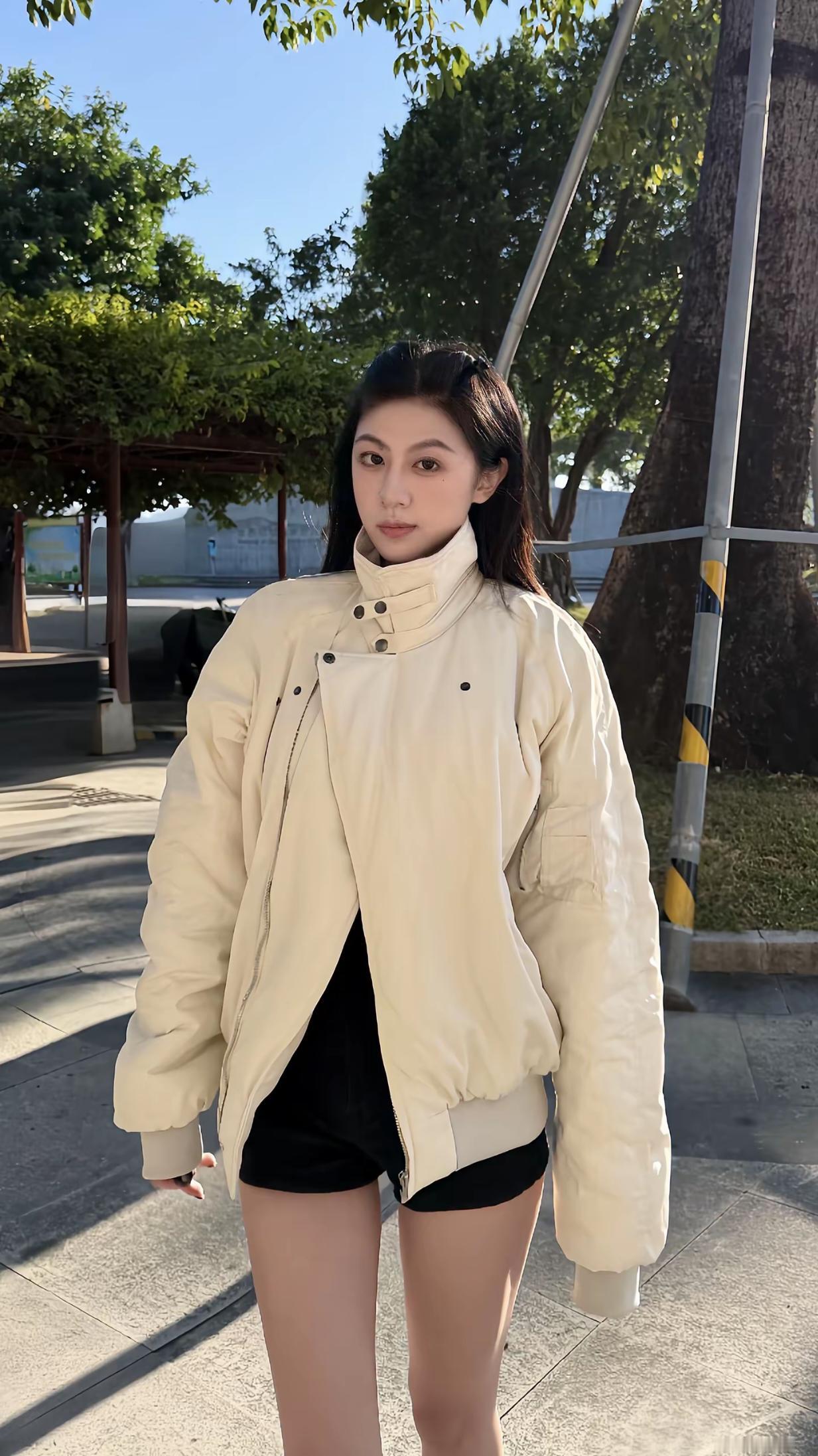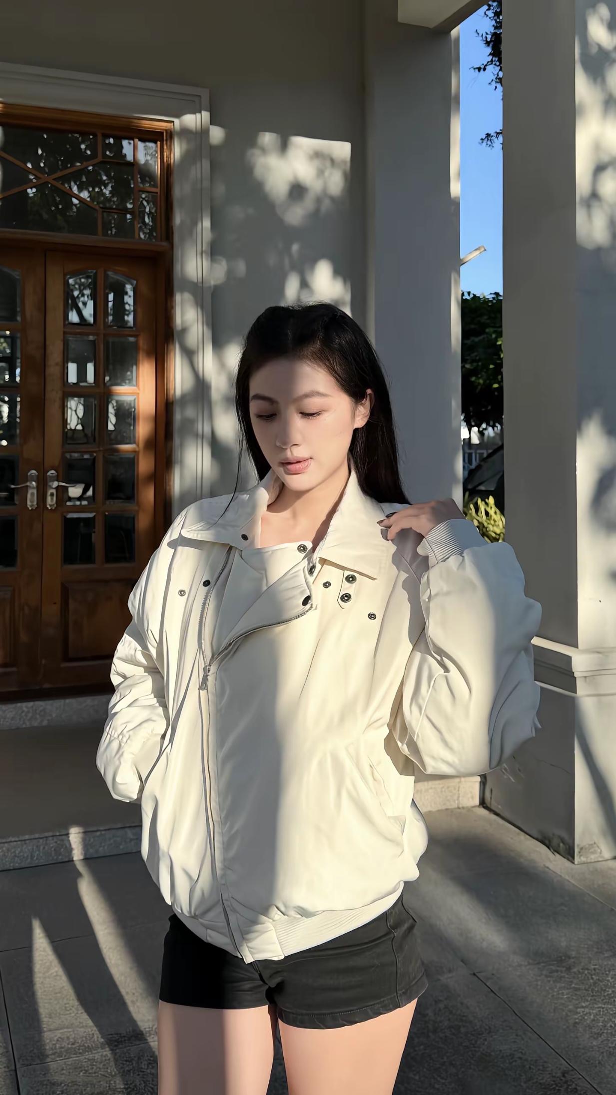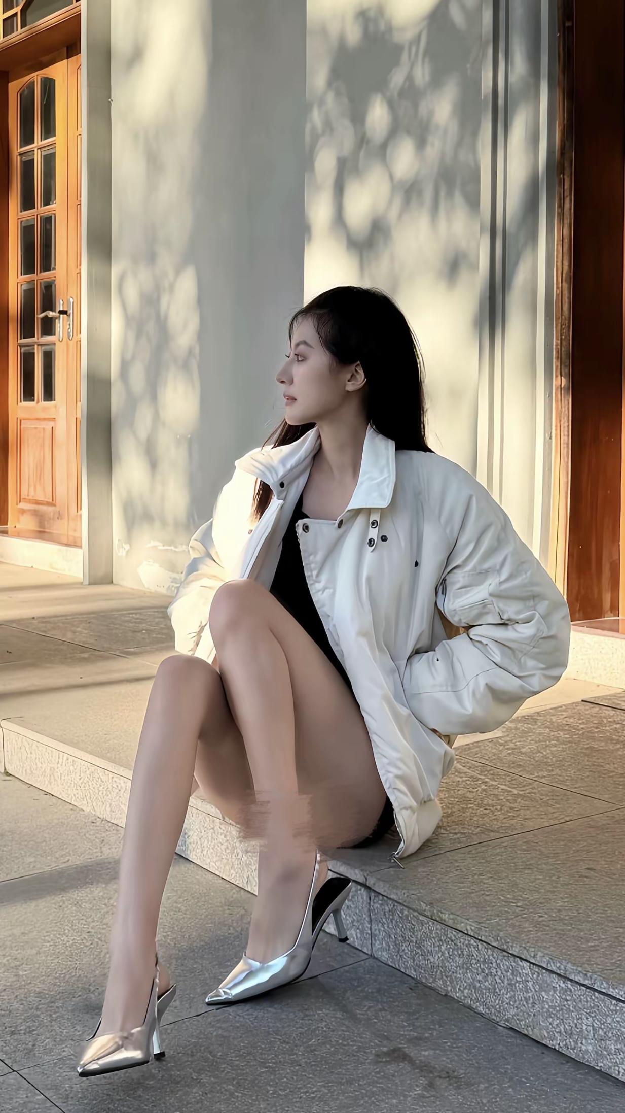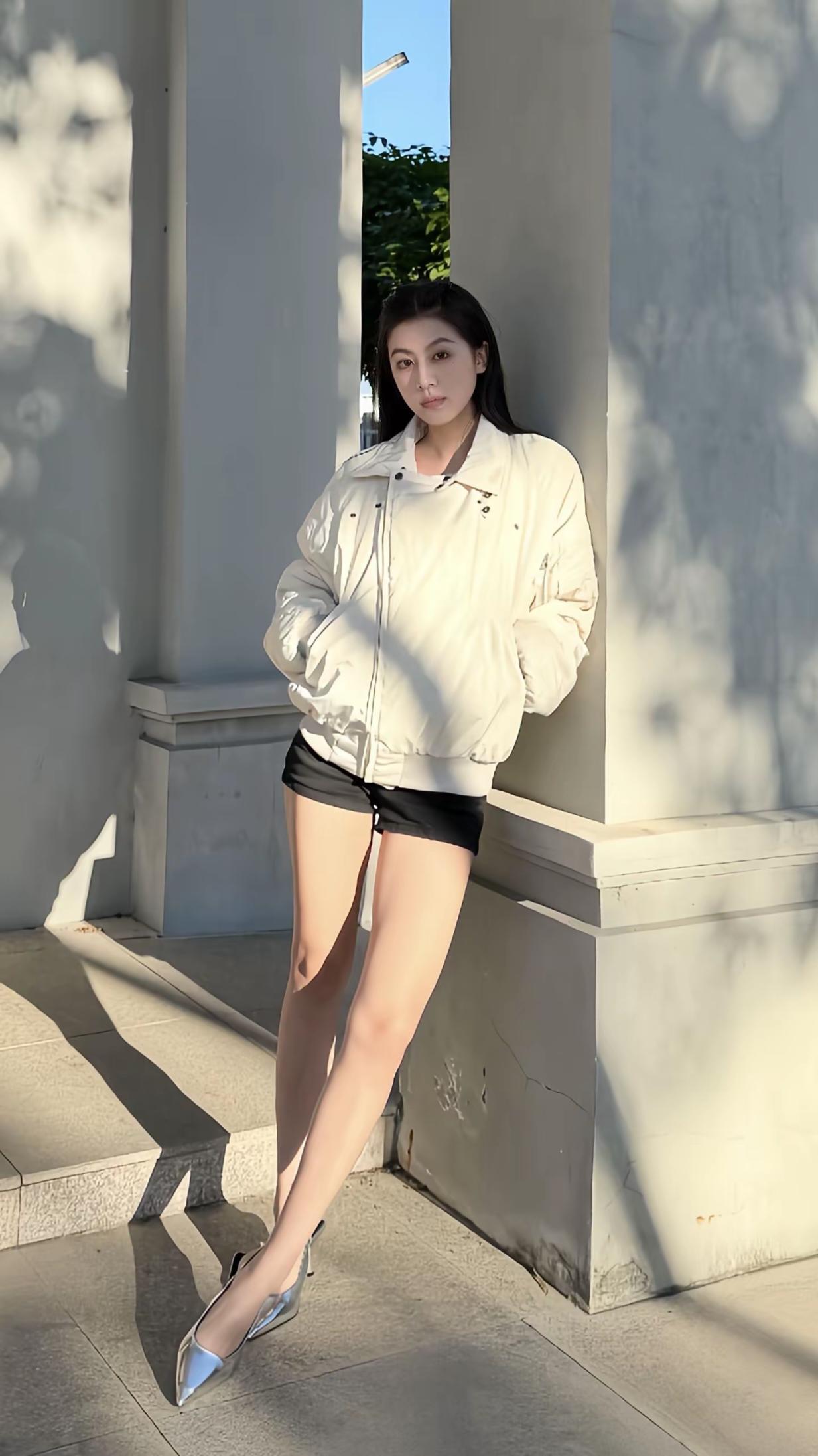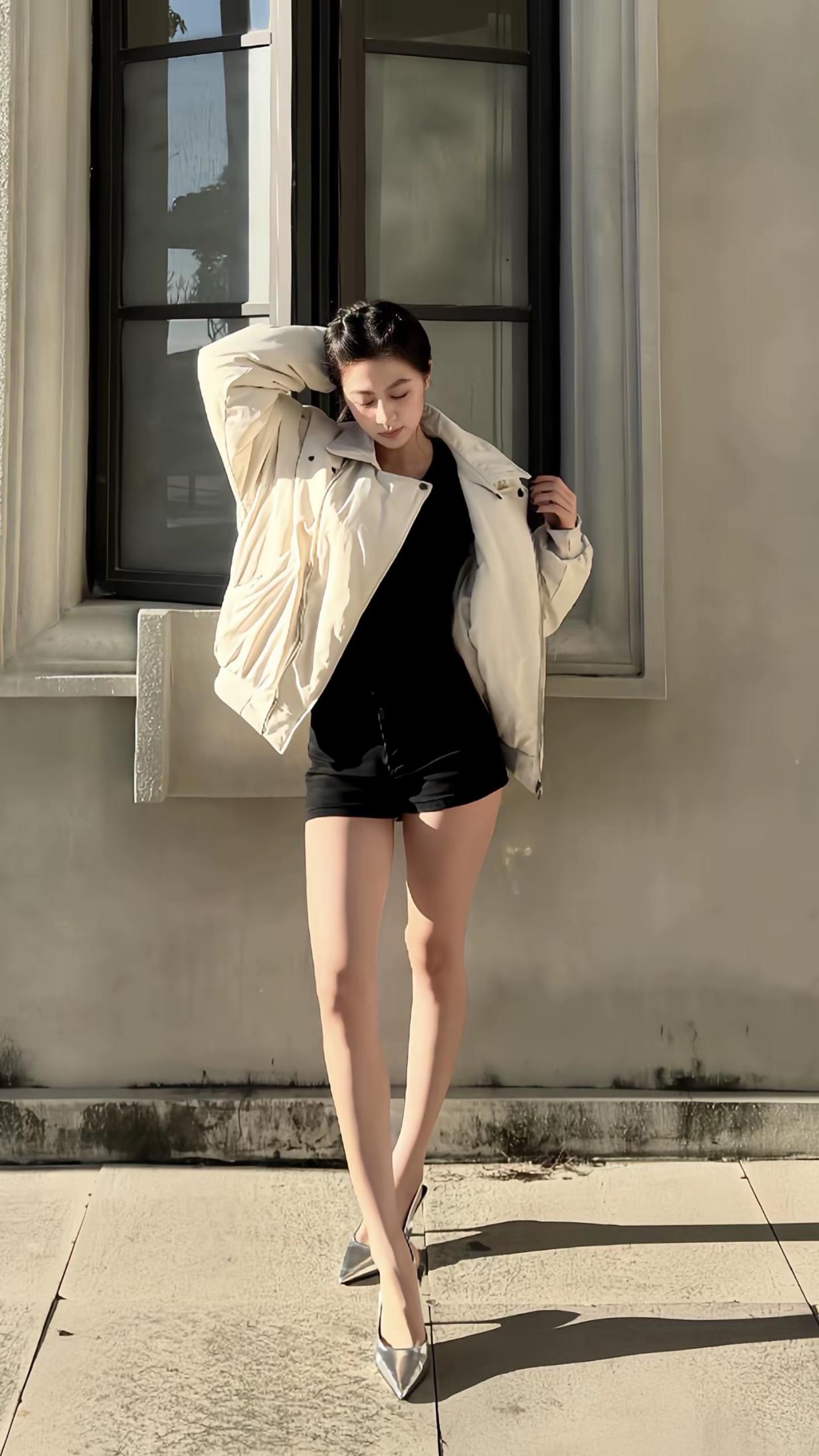 夜晚的街头,时尚穿搭,黑皮草外套搭配黑色短裤,优雅又帅气!