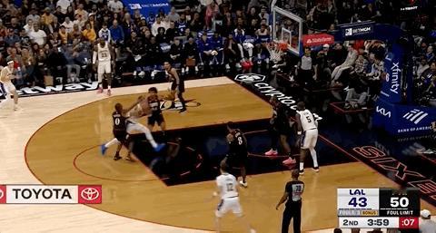 詹姆斯三分投进,得分上双! 湖人vs76人