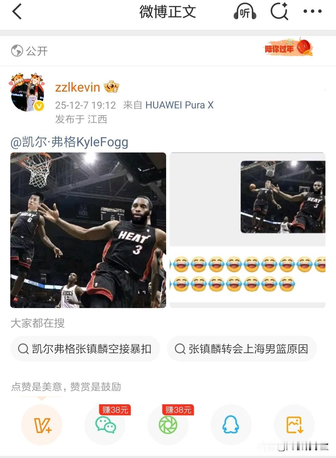 说来也奇怪,张镇麟离开辽篮后像变了一个人一样,心情大好,社媒分享他和弗格加盟上海后的首个空接配合,配图为当年热火时期韦德和詹姆斯的经典空接连线,张镇麟把他P成詹姆斯,把弗格P成韦德,并分享给队友弗格,弗格回复一连串笑哭了的表情图,看出来张镇麟和弗格加盟上海后心情都非常愉快,把天赋带到了上海达成了共识,怀疑弗格加盟上海可能还是张镇麟的牵线搭桥
