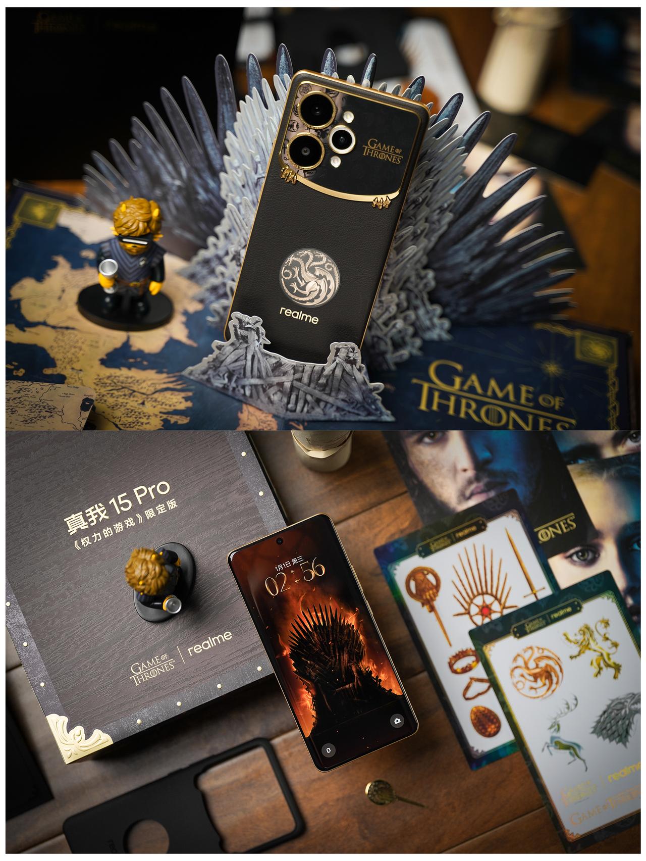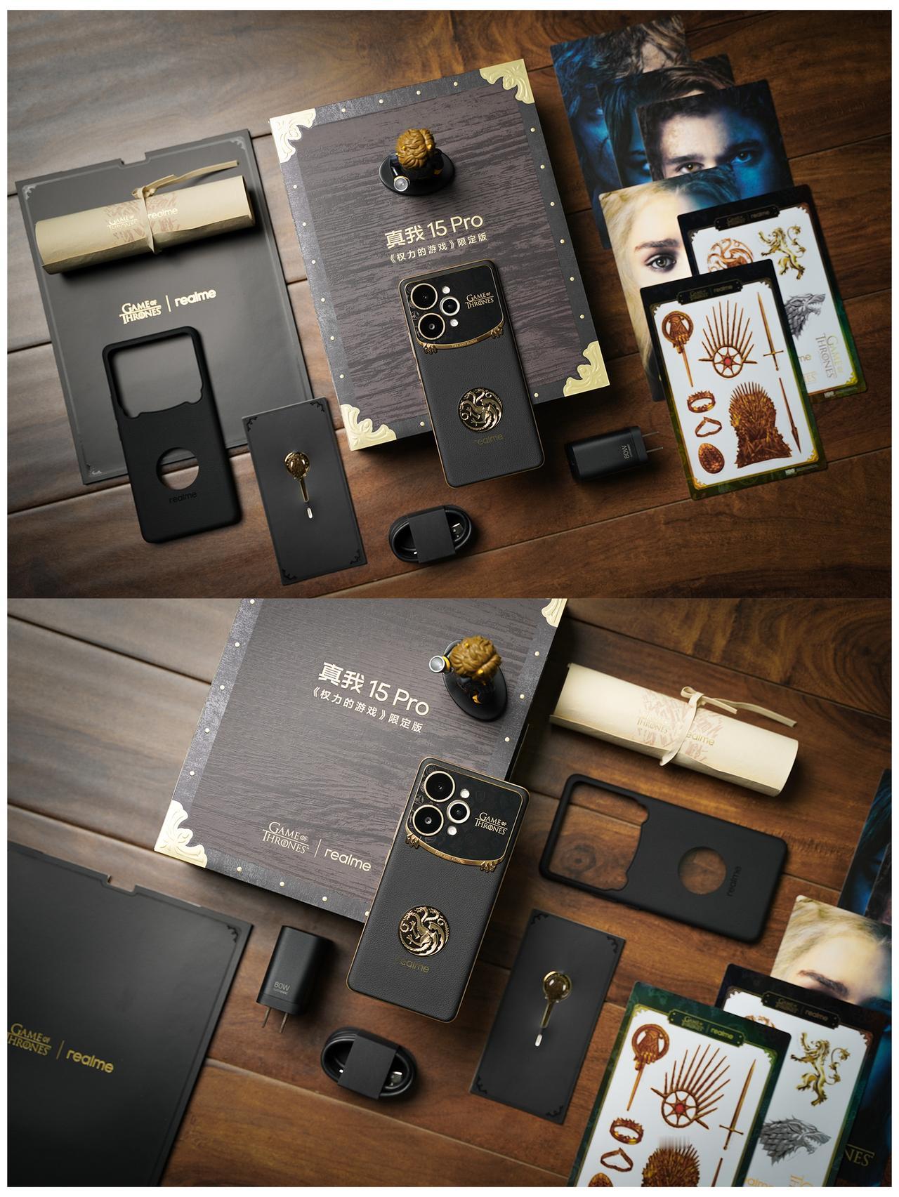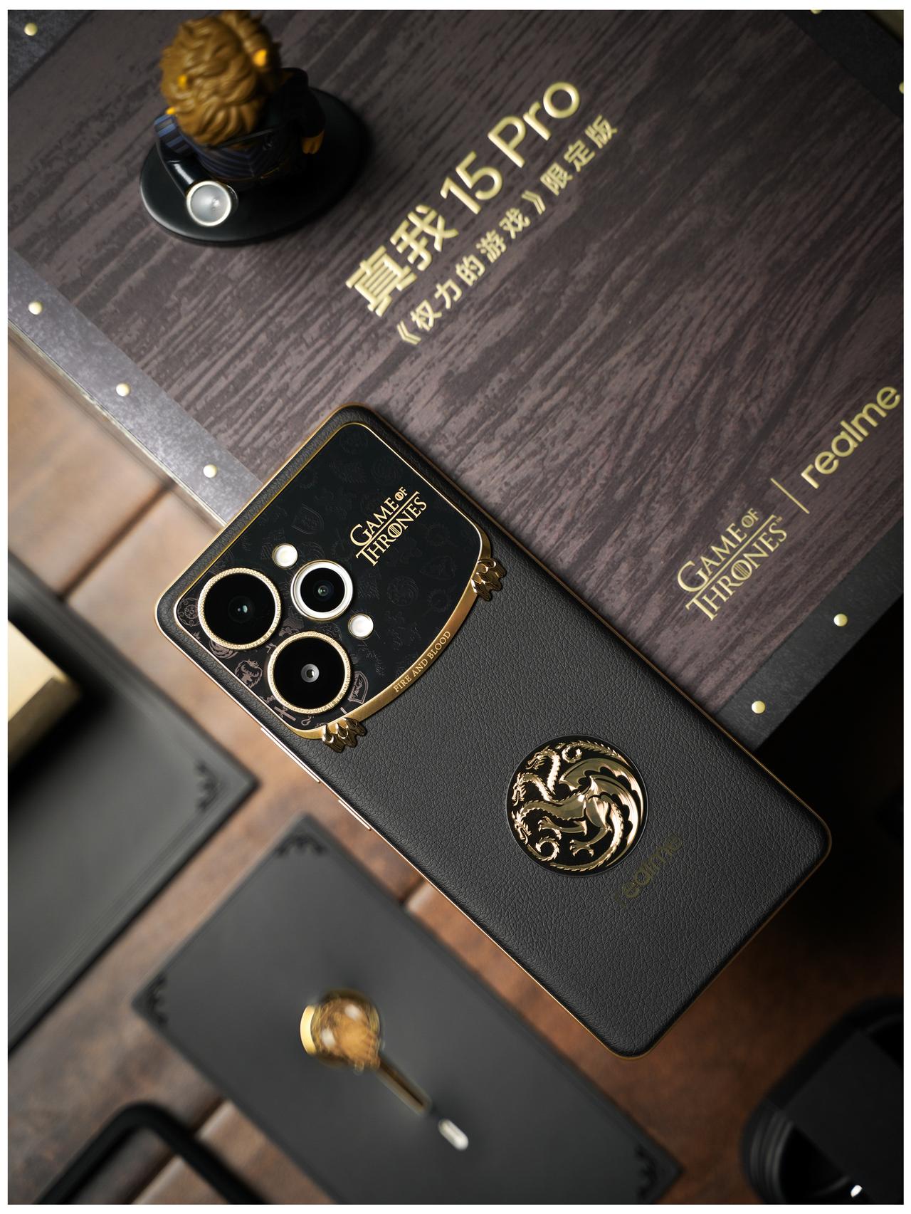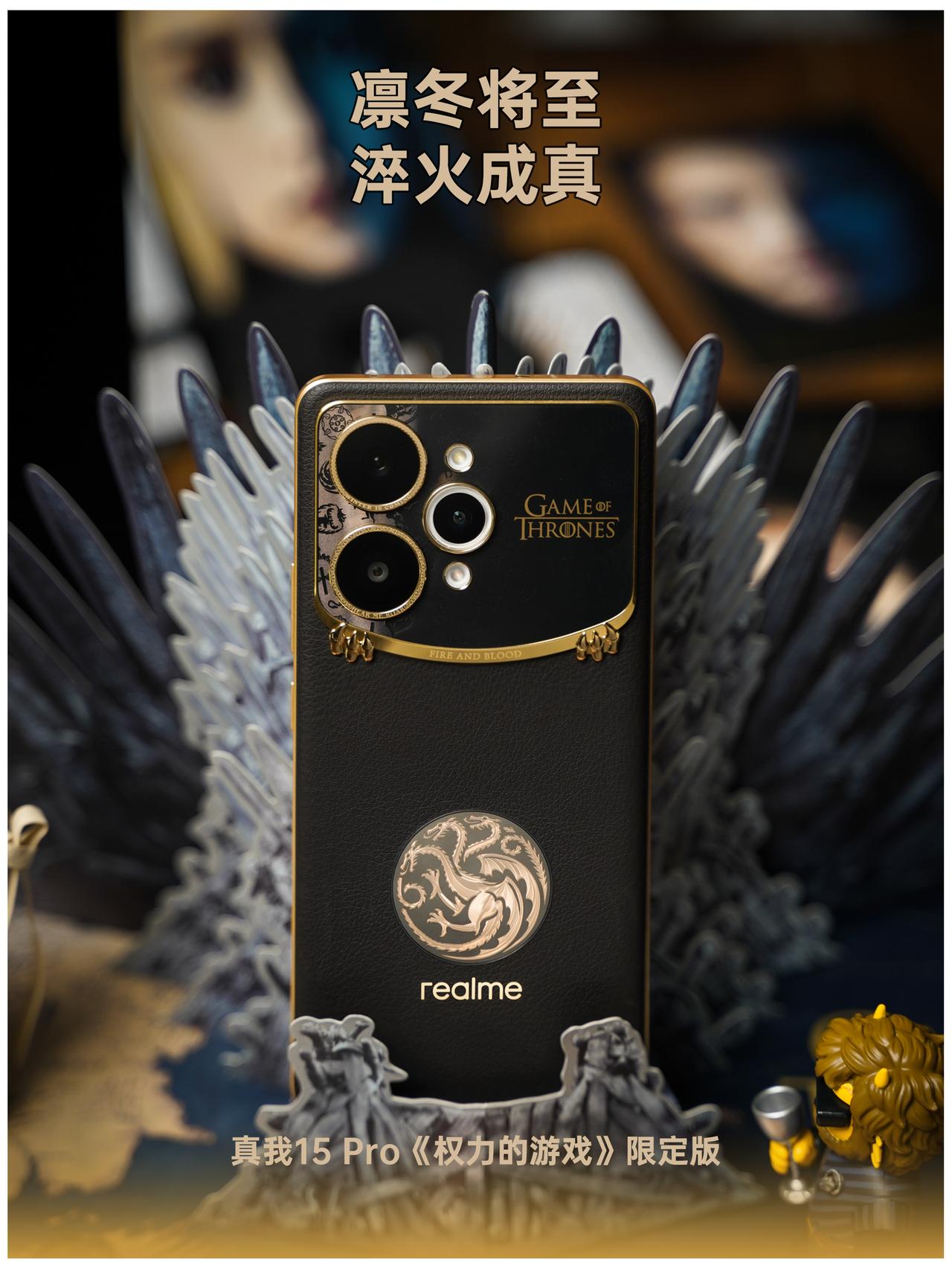 凛冬将至,淬火成真:真我15 Pro《权力的游戏》限定版 不得不说,阿真现在在联名产品上面,真的也是非常用心的“越级”。全新的真我15 Pro《权力的游戏》限定版,又是一套典藏级的产品。 用科技的力量,让经典的权游美学有着别样的呈现。从包装的龙蛋木盒,到开箱的铁王座,到定制卡针、手机壳、无字信纸、明信片和贴纸,再到手机上的鎏金龙刻、群雄纹章、龙焰玄革后盖、独特纹理点缀的镜头环,还有深度定制的UI,开机动画、充电动效、GT模式、专属滤镜和水印等,处处是细节,处处是惊喜,处处求极致。 同时在龙焰玄革的后盖上,还有着热感变色的新科技。可变色并且还是皮革的后盖,着实是第一次见。在黑色或者红色之间,加上金色的点缀,呈现出不一样的视觉盛宴。 即便作为手机单体,大电池、强性能、超清影像、AI能力等,也有着出色的表现。 科技与传奇,这一套将带来的不仅仅是一部有个性的手机,更是一场视觉的享受,情绪价值的大满足。这便是,真我15 Pro《权力的游戏》限定版,值得拥有!