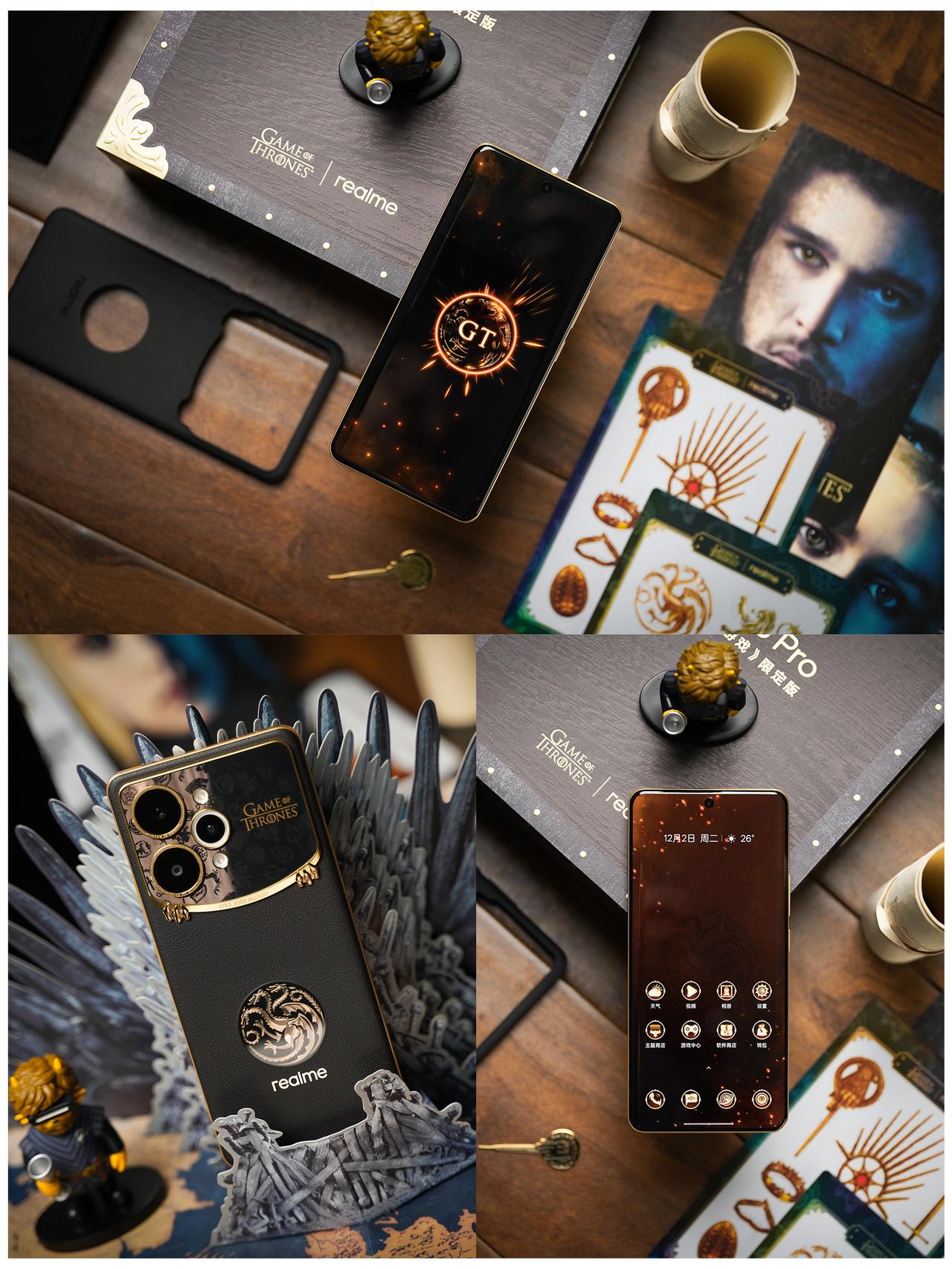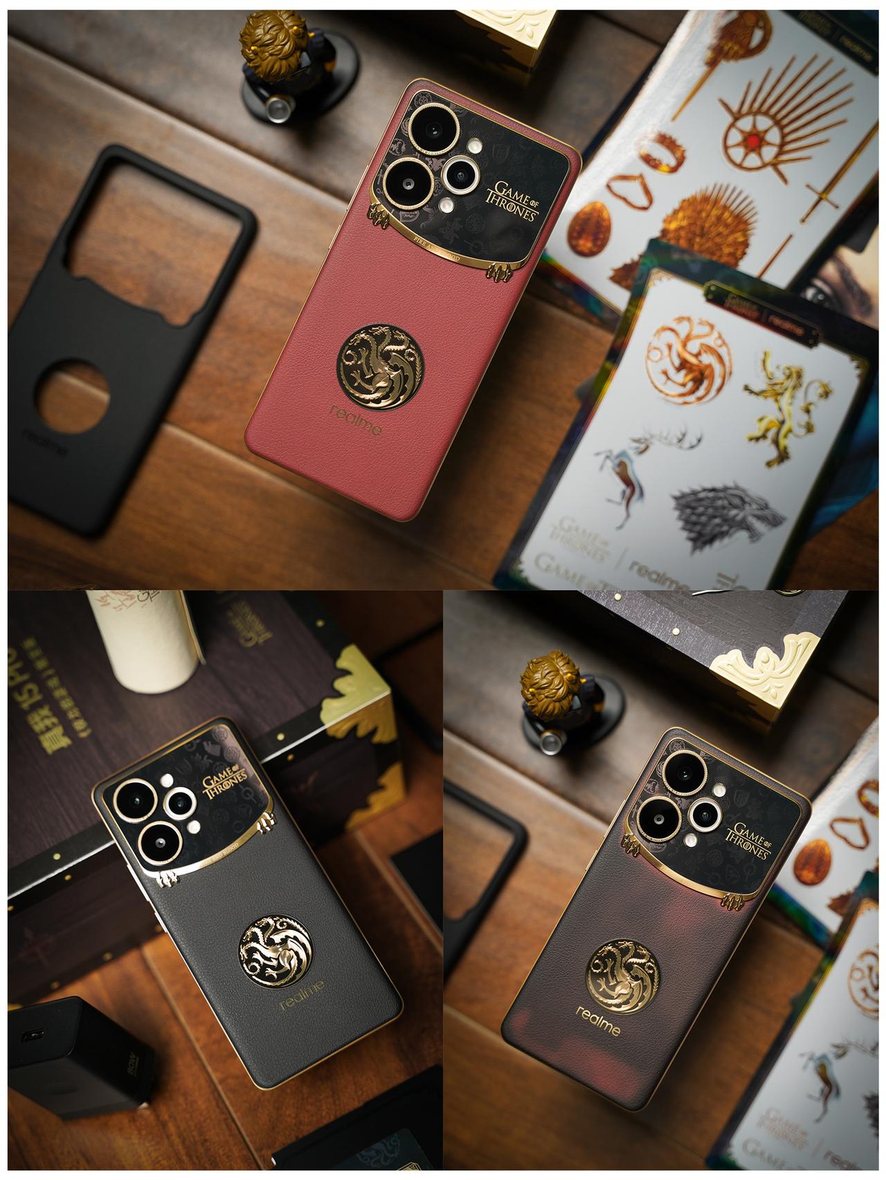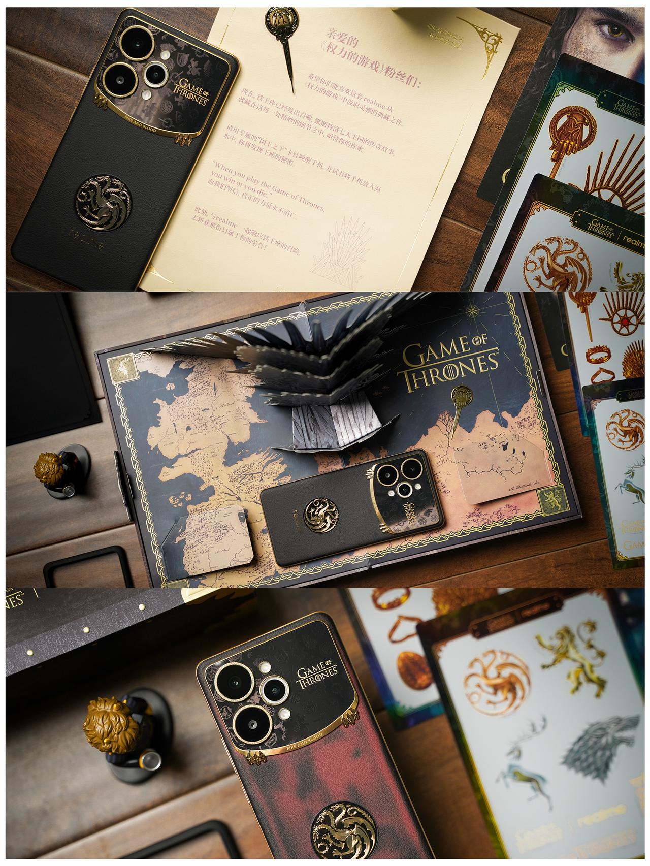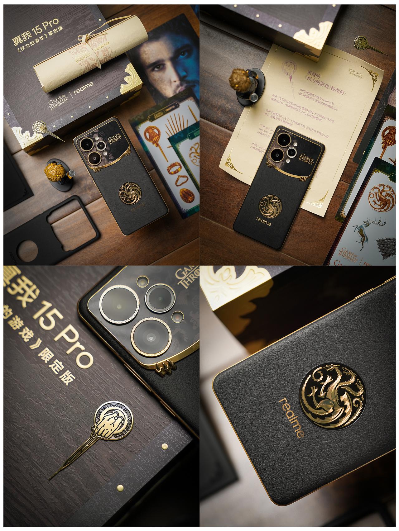 凛冬将至,淬火成真:真我15 Pro《权力的游戏》限定版 不得不说,阿真现在在联名产品上面,真的也是非常用心的“越级”。全新的真我15 Pro《权力的游戏》限定版,又是一套典藏级的产品。 用科技的力量,让经典的权游美学有着别样的呈现。从包装的龙蛋木盒,到开箱的铁王座,到定制卡针、手机壳、无字信纸、明信片和贴纸,再到手机上的鎏金龙刻、群雄纹章、龙焰玄革后盖、独特纹理点缀的镜头环,还有深度定制的UI,开机动画、充电动效、GT模式、专属滤镜和水印等,处处是细节,处处是惊喜,处处求极致。 同时在龙焰玄革的后盖上,还有着热感变色的新科技。可变色并且还是皮革的后盖,着实是第一次见。在黑色或者红色之间,加上金色的点缀,呈现出不一样的视觉盛宴。 即便作为手机单体,大电池、强性能、超清影像、AI能力等,也有着出色的表现。 科技与传奇,这一套将带来的不仅仅是一部有个性的手机,更是一场视觉的享受,情绪价值的大满足。这便是,真我15 Pro《权力的游戏》限定版,值得拥有!