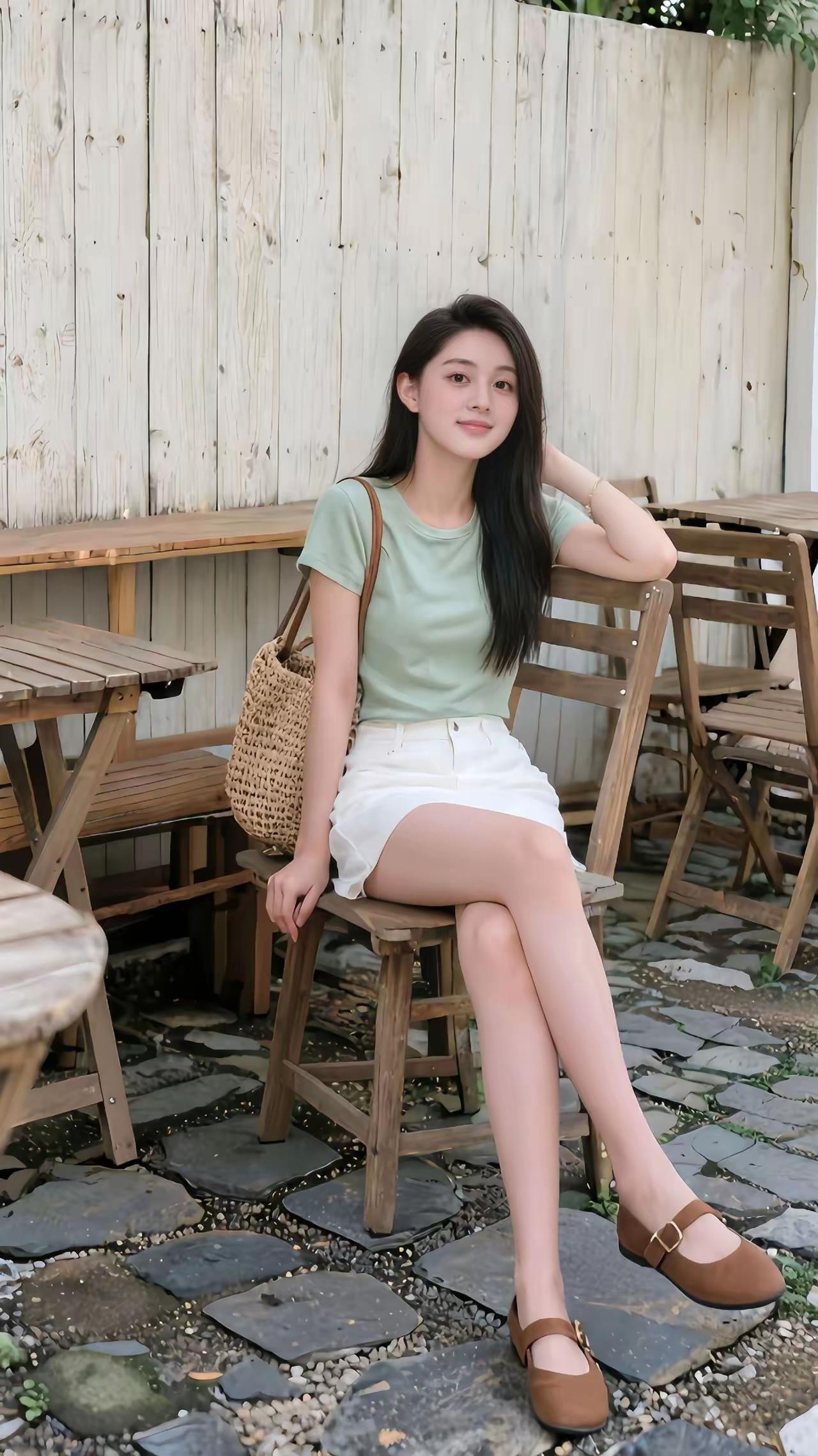 夏日清新穿搭,浅绿色上衣+白色短裙,搭配棕色凉鞋,轻松惬意。