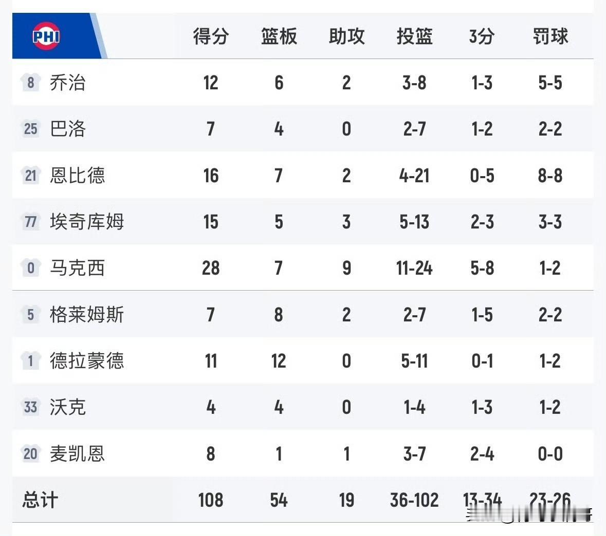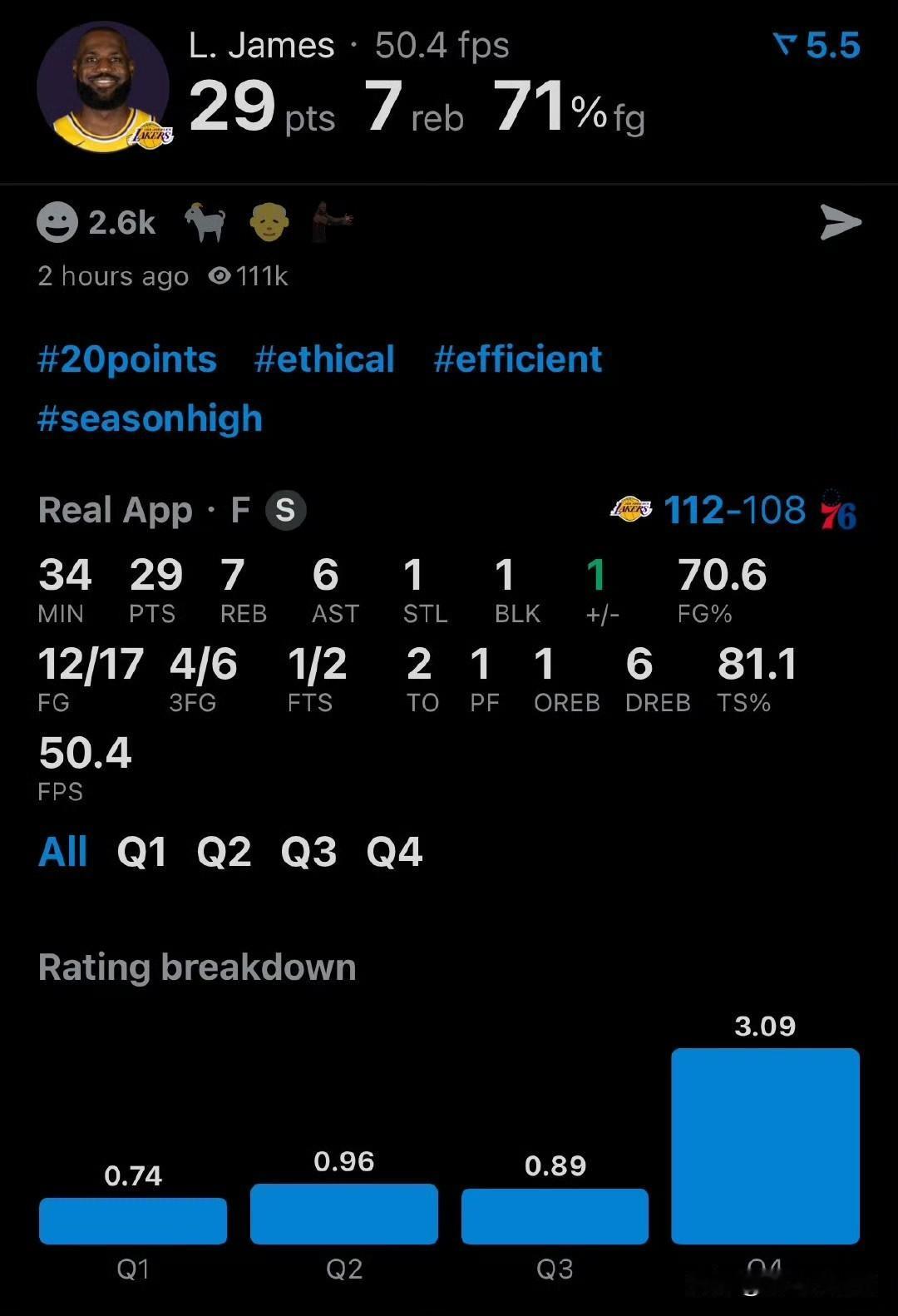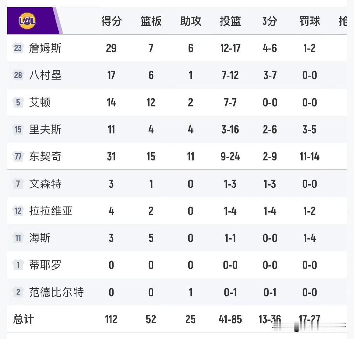 里夫斯状态不佳,詹姆斯顺势而为!!!东契奇复出砍三双,东詹合砍60分,湖人胜76人! 湖人最终112-108险胜76人,从客场偷走一场胜利,顺利完成客场之旅,可以打道回洛杉矶了,湖人最后时刻的得分很关键,很显然这是76人不具备的。 湖人方面: 全队五人上双,这五个人都是首发,替补无一人上双,东契奇31+15+11,詹姆斯29+7+6,八村17分,艾顿14分12篮板,里夫斯11分。 76人方面: 全队五人上双,首发四人,替补一人,马克西28+7+9,恩比德16分,乔治12分,埃奇库姆15分,庄神11分12篮板。 东契奇带着长途跋涉的疲惫仍然完成了高光表现,而詹姆斯在里夫斯状态不佳时,把握赛场局势,顺势而为打出了自己的出色表现,本场比赛最后时刻太强了。 恭喜湖人获胜,周四刚哥回归,全员健康了! 湖人赛程 湖人 湖人队里夫斯 里夫斯 詹姆斯 东契奇 恩比德 乔治
