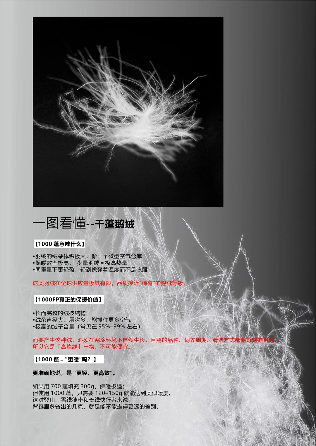 绒是来自北纬 45°“黄金羽绒带”的冰雪级鹅绒,以接近行业天花板的9️⃣00蓬松度和超高绒子含量;再加上拒水处理,提供了在湿冷和风雪中等极端环境中装备重量与保暖比的最大化输出;石墨烯里布强化蓄热能力,暖得更快、热循环更均衡