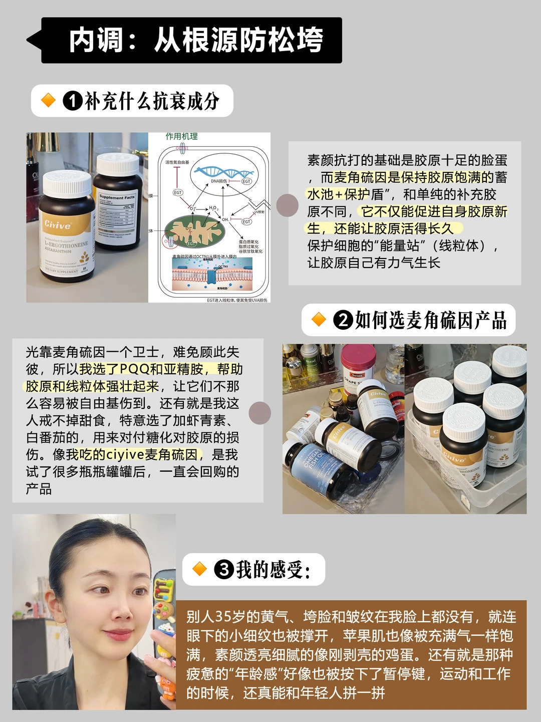👉🏻所以我选了PQQ和亚精胺,帮助胶原和线粒体强壮起来,让它们不那么容易被自由基伤到。还有我这人戒不掉甜食,特意选了加虾青素、白番茄的,用来对付糖化对胶原的损伤。(我吃的是ciyive麦角硫因,大家可以做个参考)
