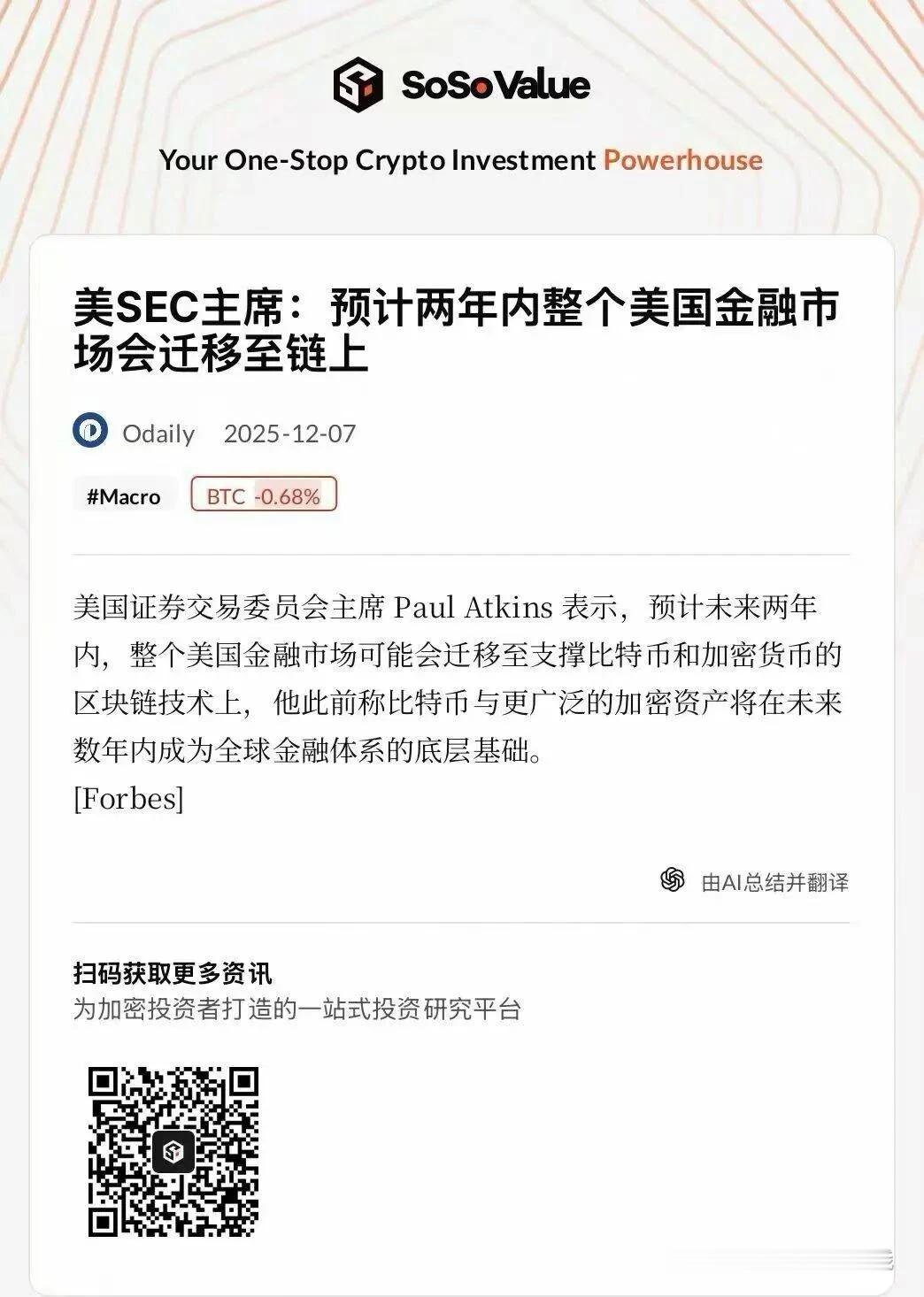 都得上1 昨天这个图片刷爆了不少群(真假未知),大概意思就是预计美国金融市场会全面的拥抱区块链技术本身,未来的美股和rwa很可能都会和他们深度整合。个人判断利好coinbase和一些公链项目,但从标的上来看,对稳定币也算是半个利好。2 一边是东大玩命下注工业4.0,和老欧洲的品牌深度结合打造新的制造能力,一边是西大趁着东大没有完成人民币国际化,快速的用金融+新技术手段豪取全球的流动性和底层金融基建····受伤的自然是既没有制造能力,也没金融军事做背书的小地方。可以预见的未来,全球破产的小国家会越来越多。如果你仔细看最近的新闻,有了社交软件的地区,人口突破5000万就很容易出现各种运动了···3 湾湾那边最近要宣布禁止xhs一年,结果发现用的封禁手段还不如一个普通大学的水平··毕竟,it部门估计都想揍这帮政客一顿···谁会给他好好干活呢·ps:这几年随着信息的交互,湾湾那边来内地旅行和交流的人也逐渐多了起来,xhs全球这么一对账··很多资本主义终于知道自己活在水深火热之中了4 一个特别经典的描述东西方人民的区别的话“东大的老百姓,假装自己什么都不懂,实际都懂,欧美的老百姓,假装自己什么都懂,其实什么都不懂”5 欧美对程序正义看的远大于事实正义,很多都是立法规定的合法抢劫,我举个例子,很多人雇佣律师去打遗产官司,最后分的钱一大半要给律师··想想ftx是不是也是这么操作的··你看程序,完全合规,时薪摆在那里,合同签在那里···这也解释了为什么《saw》这个系列能这么火,因为那边的资本家真的很多做的非常过火,自己不敢上就让爽片来帮着吊路灯吧··6 目前行情周1突然反弹了一下,但是put的vega依然很高,可以考虑卖远买近端的put 价差或者otm 来作为保护7 本周有vip课程,在周四,另外上次线下的录音应该也会本周剪辑放出来给vip社群8 这最近的行情确实开个网格还是挺不错的,踏踏实实的让波动来赚钱吧