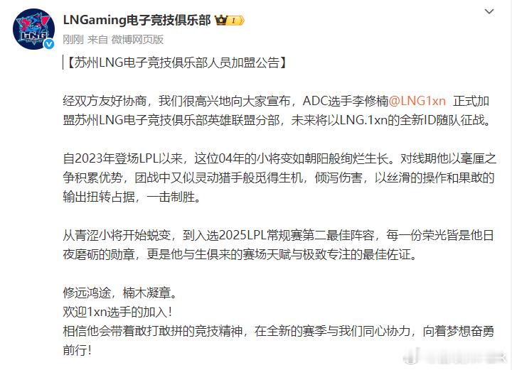 就在刚刚,LNG官宣1xn加入,下赛季朝着登峰组迈进!所以LNG明年的阵容是Sheer、Croco、韩国姿态、1xn、Missing我其实一直挺看好1xn的,在陪练团的表现也不错,得到了几位教练的认可,这次去苏州和Missing好好加油吧。LNG官宣1xn加入 2025LOL冬季转会期ACG优创官