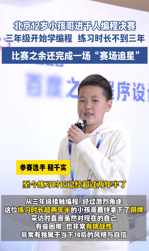 北京12岁小孩哥进千人编程决赛随着科技的不断发展,青少年编程逐渐成为了一种热门的教育方式,可以让孩子在未来的职业生涯中更具竞争力。北京小孩哥混入清北赛场