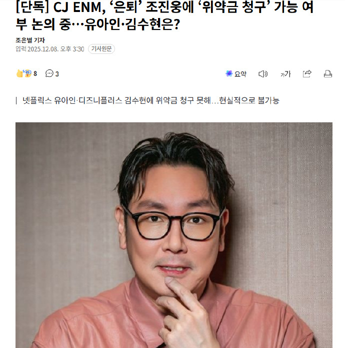 CJ正在讨论是否向赵震雄提出违约金索赔信号制作公司或将向赵震雄索赔违约金 因少年犯前科曝光而闪电宣布隐退的演员赵震雄,是否会面临巨额违约金索赔?预定于2026年播出的电视剧《信号2》主演赵震雄宣布隐退,导致该剧播出前景不明。据确认,CJ ENM于8日上午召开了由代表主持的会议,讨论了是否向赵震雄提出违约金索赔。一位相关人士透露:"在当天的会议上讨论了此事,制作公司Studio Dragon的相关人员正在向法务团队确认'是否可以进行违约金索赔'。"《信号2》是2016年引发热潮的电视剧《信号》的续集。由金恩熙编剧执笔的《信号》是一部过去与现在的刑警通过无线电沟通、解决长期未结案件的刑侦剧,被誉为"开创了韩国式类型片新天地"而广受好评。第二季是为纪念《信号》播出10周年和tvN开台20周年,由第一季的金恩熙编剧以及金惠秀、李帝勋、赵震雄等原班人马再度合作。据悉,制作方投入的制作费高达数百亿韩元。赵震雄在续集中,与前作一样,继续饰演正义形象的强力系刑警李材韩。