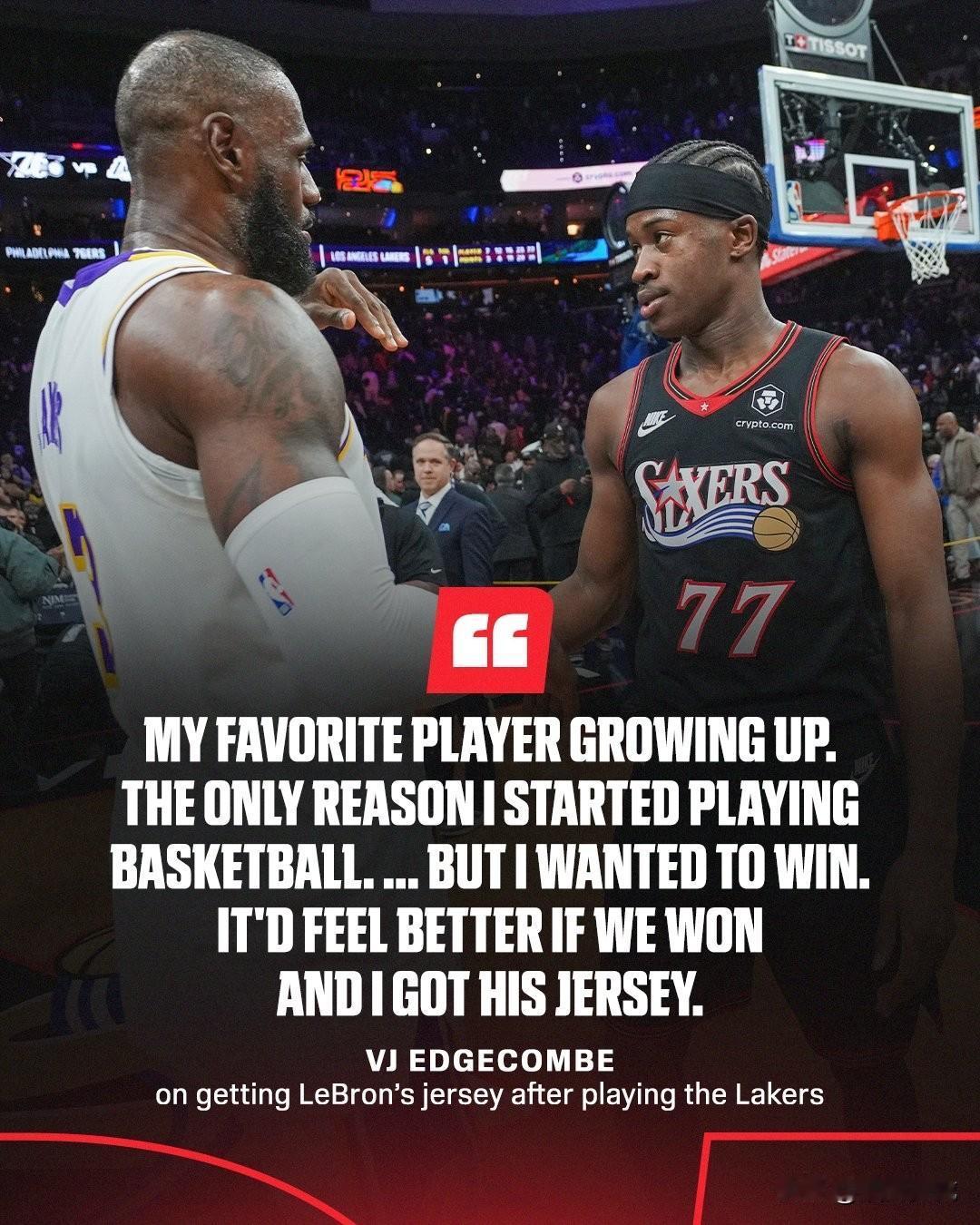 埃奇库姆对詹姆斯是真爱,也很有上进心,未来可期! 今天76人在主场输给湖人后,埃奇库姆在赛后接受采访时表示“詹姆斯是他从小到大最喜欢的球员,也是他开始打篮球的唯一原因。能得到詹姆斯的球衣对他意义重大…但他更想要赢球,如果能在赢得比赛后拿到詹姆斯的球衣,会让我感觉更开心。” 詹姆斯在今天出战34分12秒,17投12中,拿下29分、7篮板、6助攻,可谓是宝刀未老,也算给埃奇库姆树立了榜样,相信埃奇库姆接下来也会越打越好,毕竟吃过苦的穷人的孩子更会珍惜机会并努力奔跑!