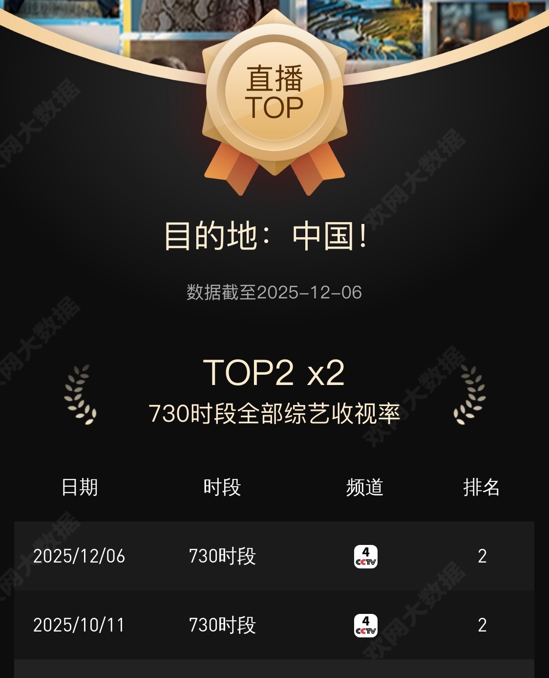 上周末目的地的收视率不错耶🙊全国七点半时段综艺类第二 (新一季准确的播出时间是周日七点半哦~)