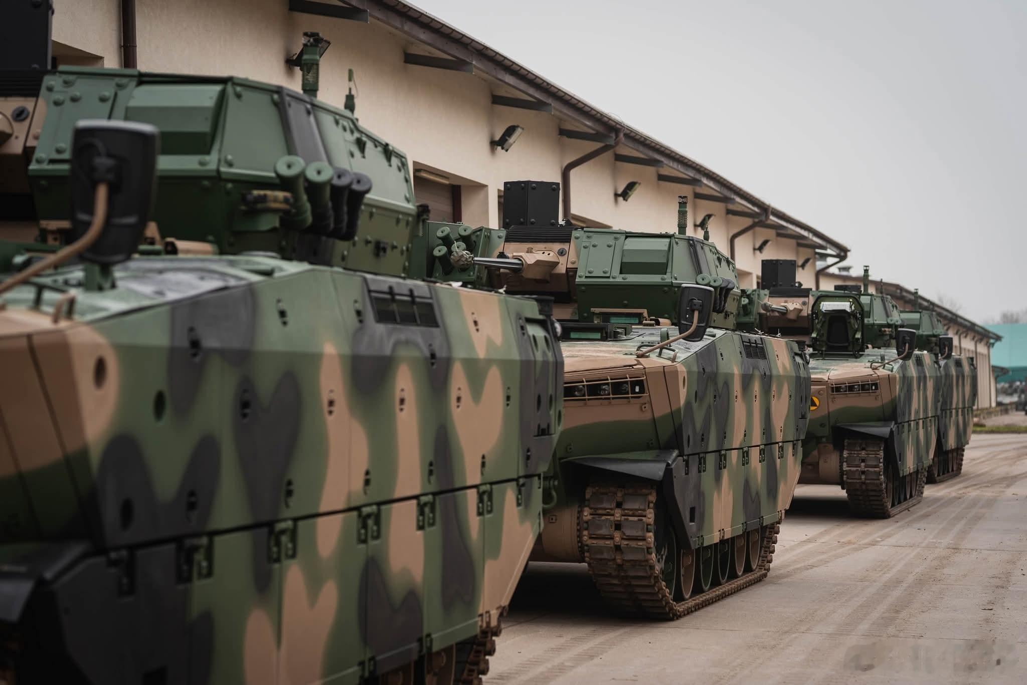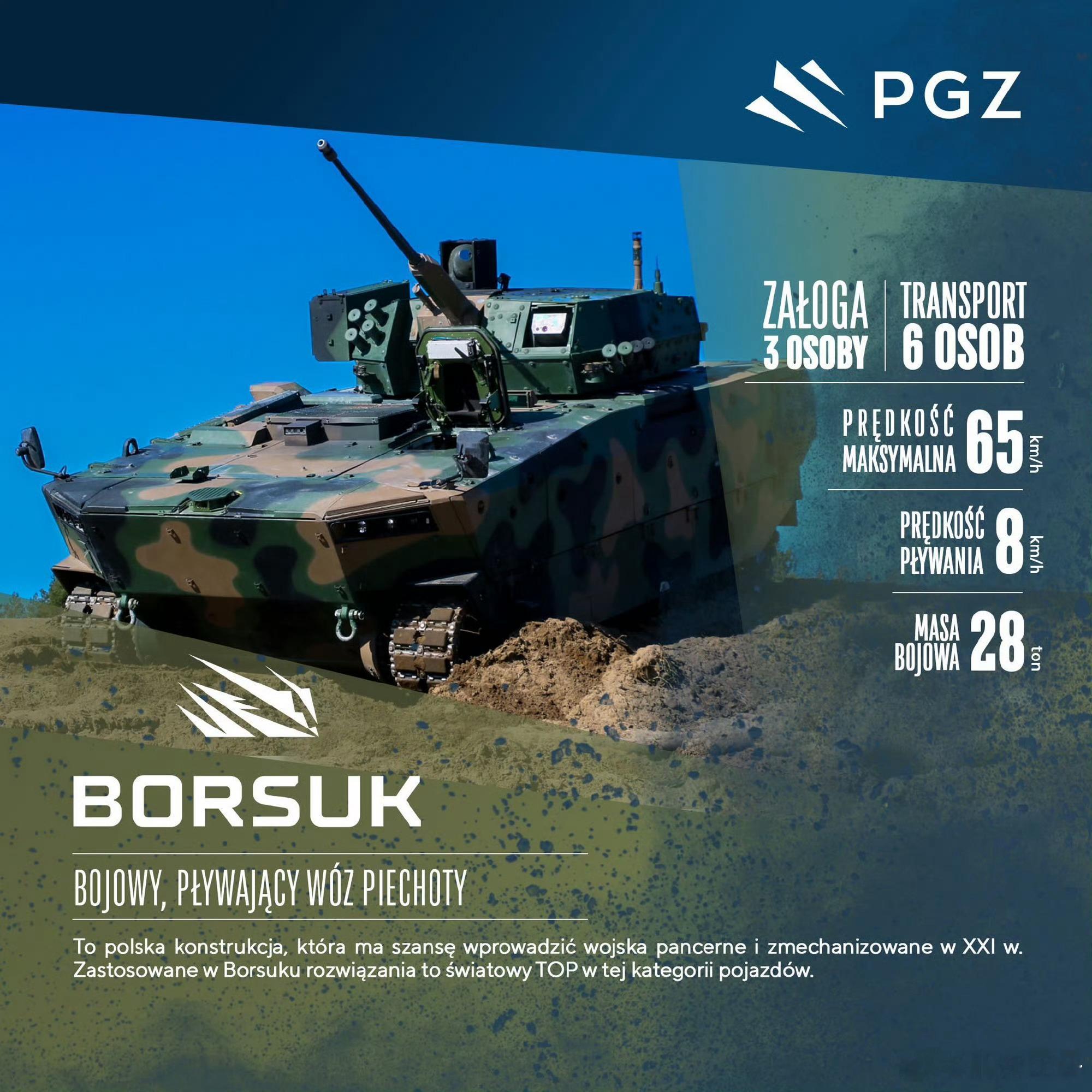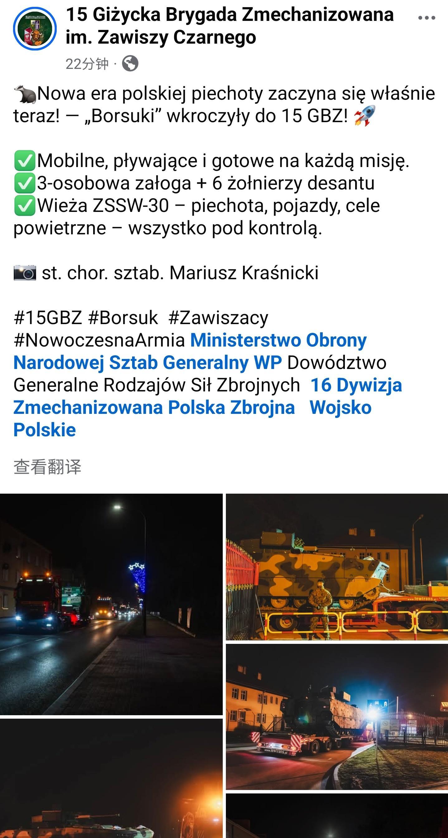 波兰第16机械化师接收首批“獾”(Borsuk)新型两栖步兵战车(NBPWP),第16机械化师(驻军:靠近波兰-俄罗斯*边界)* 加里宁格勒,由于防区存在沼泽湿地,因此需要车辆具备两栖机动能力,与此同时,波兰已经从韩国采购了180辆K2GF主战坦克,“獾”新型两栖步兵战车将与配备K2GF坦克的新机械化师配对,“獾”步兵战车的特点是机动性高,能够克服各种地形障碍,包括水面河流等。:波兰计划采购1,400辆“獾”通用模块化履带平台车族,其中1,000多辆将会是步兵战车型(BWP),以取代近千辆的旧式BWP-1步兵战车和相关变型,而且其他“獾”专用车型将包括:履带式侦察输送车(ŻUK)、履带式指挥车(OSET)、医疗输送车(GOTEM)、装甲抢修车(GEKON)、核生化污染侦察车(ARES )。“獾”基本型步兵战车重28公吨,车辆人员为3+6配置,车组包括车长、驾驶与炮长,携带6名下车步兵。车辆由MTU的720马力8V-199 TE20柴油发动机提供动力,并与帕金斯X300液压传动系统相连,该动力包组合将由WZM公司采许可证方式于波兰生产制造。车辆最大公路时速可达65km/h。“獾”采用了霍斯特曼的肘内液气悬挂系统,每侧共6组,履带采用了DST的iDLT双销挂胶履带系统,其中液压履带张紧装置位于最后一对负重轮与惰轮之间。“獾”两栖步兵战车在车首设有可收放的挡浪板,车辆在车尾两侧则各有一组喷水推进器,以为水上航行的车辆提供推进动力,水上航速约8km/h。“獾”步兵战车安装了HSW集团与WB电子集团联合研制的30毫米ZSSW-30无人炮塔系统,其安装有诺斯罗普格鲁曼的30毫米Mk44S机炮与7.62毫米UKM-2000C同轴机枪,炮塔右侧装有双联装“长钉LR”反坦克导弹发射架,主炮俯仰角-9°/+60°,每分钟射速200发/分,可发射空爆编程弹(ABM)。此外炮塔还加装了PCO的SSP-1 “Obra-3”激光告警系统,结合烟雾弹发射器自动为车辆提供实时隐蔽保护。ZSSW-30无人炮塔安装有波兰PCO集团开发的光电观察装置,炮长采用了PCO的GOC-1 NIKE稳定型光电瞄准装置,第三代中波红外热成像仪、昼间电视通道、人眼安全激光测距仪,瞄准线双向稳定。车长则采用PCO的GOD-1 IRIS周视稳定型光电瞄准装置,集成了第三代长波红外热成像仪、昼间电视通道、人眼安全激光测距仪。“獾”的驾驶使用了PCO的KDN-1 NYKS昼夜观察装置,包括昼间与微光通道,而车辆四周安装有PCO的SOD-1 ATENA周向观察系统,提供昼间与非制冷热成像通道,为车长与其余车组提供完整的态势感知能力。“獾”步兵战车由装甲钢焊接而成,在28吨级配置下,安装有模块化陶瓷贴花装甲套件,可全向抵御14.5毫米重机枪,正向抵御华约30毫米AP穿甲弹,车底的防雷装甲组件则可有效防护地雷与IED袭击,据报道已经经过8公斤TNT炸药的防雷测试,代表至少满足北约STANAG 3A防雷标准。“獾”步兵战车还安装有WB集团的FONET数字通信系统,以及集成有霍尼韦尔许可WZE制造TALIN 5000惯性导航系统的新型BMS战场管理系统。每天认识一件兵器烽火问鼎计划