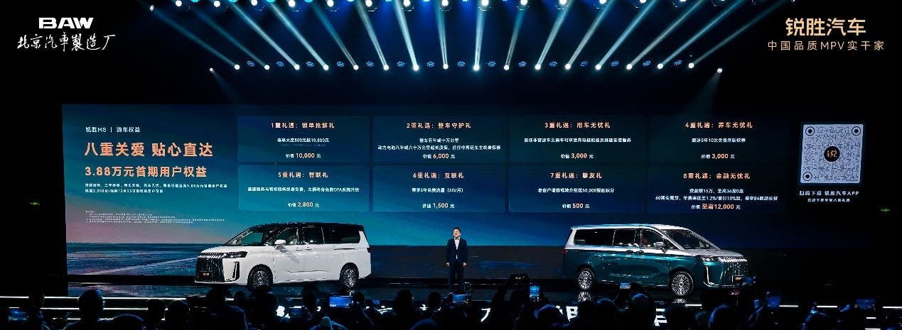 锐胜M8上市 12月5日,锐胜汽车首款大型MPV锐胜M8正式上市,叠加补贴后限时售价12.98万元起,CNG版低至11.68万元起,8大购车权益进一步降低消费门槛。该车以“三排都是商务舱”为核心,凭借5317mm车身、3200mm轴距打造6180L超大空间,可容纳7名1.8米成年人与18个20寸行李箱。动力提供增程、纯电、燃气三种模式,增程版CLTC综合续航1420km,10分钟可完成30%-80%补能;纯电版最高续航560km。舒适性上,全车配备7层人体工程学座椅,一二排支持通风、加热、按摩功能;配置搭载高通骁龙8155芯片、地平线L2级辅助驾驶,75%高强度钢车身保障安全。发布会现场,北京汽车制造厂有限公司副总裁顾志宏指出,当前MPV市场存在“豪华专属”与“将就工具”的两极分化。锐胜汽车选择聚焦MPV领域,致力于“让MPV造福于民”,打造真正符合中国家庭与实干家需要的“全能伙伴”。锐胜汽车锐胜M8国民MPV应该什么样