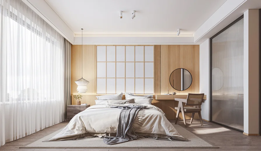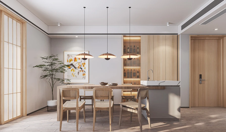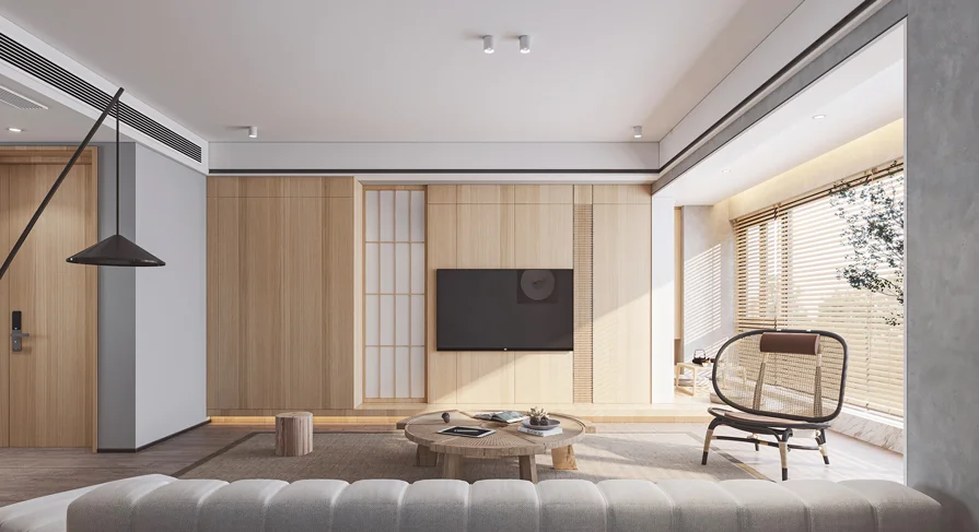 本案是116平米三居室,业主一家三口,原木元素与生俱来的自然气息让人回归生活本真的纯粹,木隔栅+绿植点缀日式的清新感扑面而来。全屋无主灯设计,用光层次丰富。米色布艺沙发静静地倚靠着,与质朴的茶几互相呼应,柔和的光线让空间更显温馨。