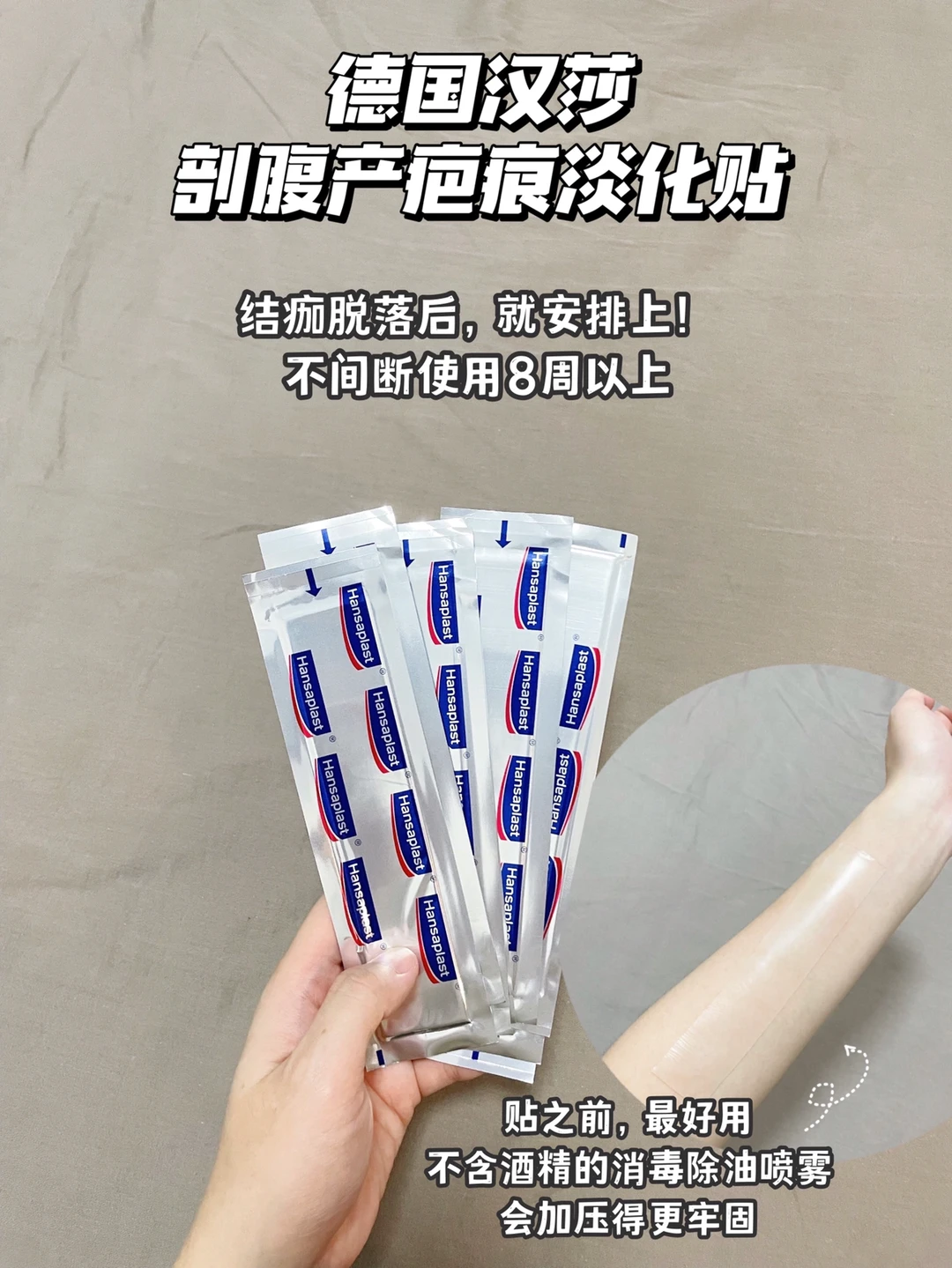 3️⃣疤痕淡化贴:结痂脱落后,每天贴12小时,它是物理加压的,用起来有点热热的,那是在封闭加速疤痕的水合作用,我预防+淡化增生的神器,记得买大号的。