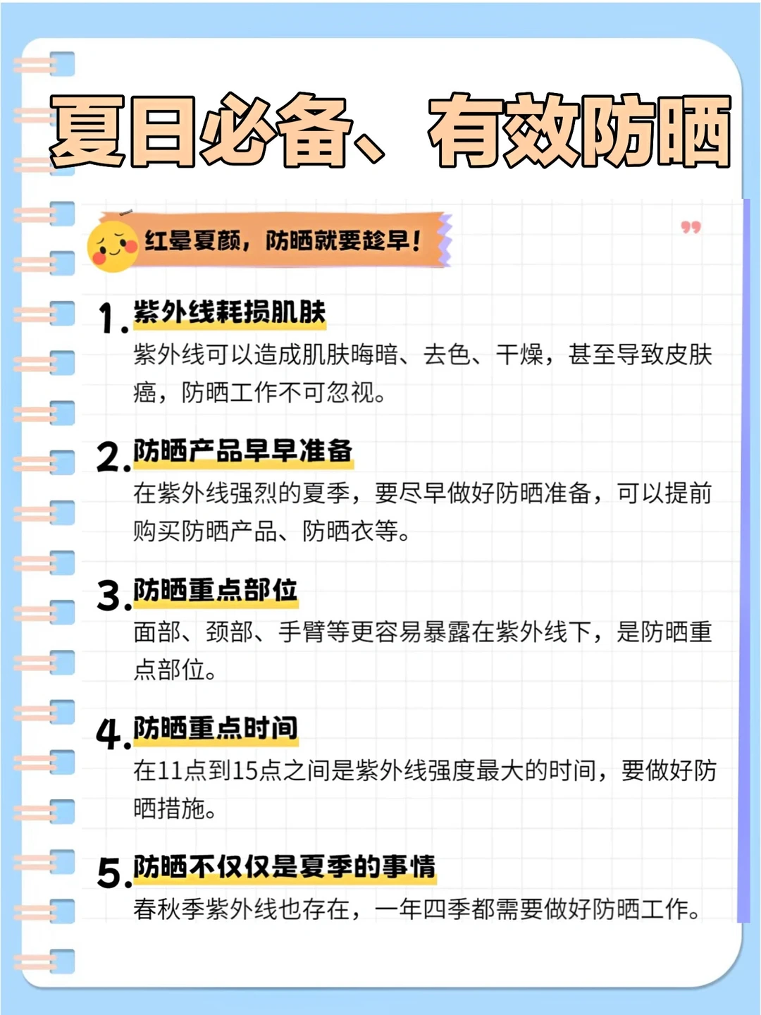 在紫外线强烈的夏季,要尽早做好防晒准备,可以提前购买防晒产品、防晒衣等。