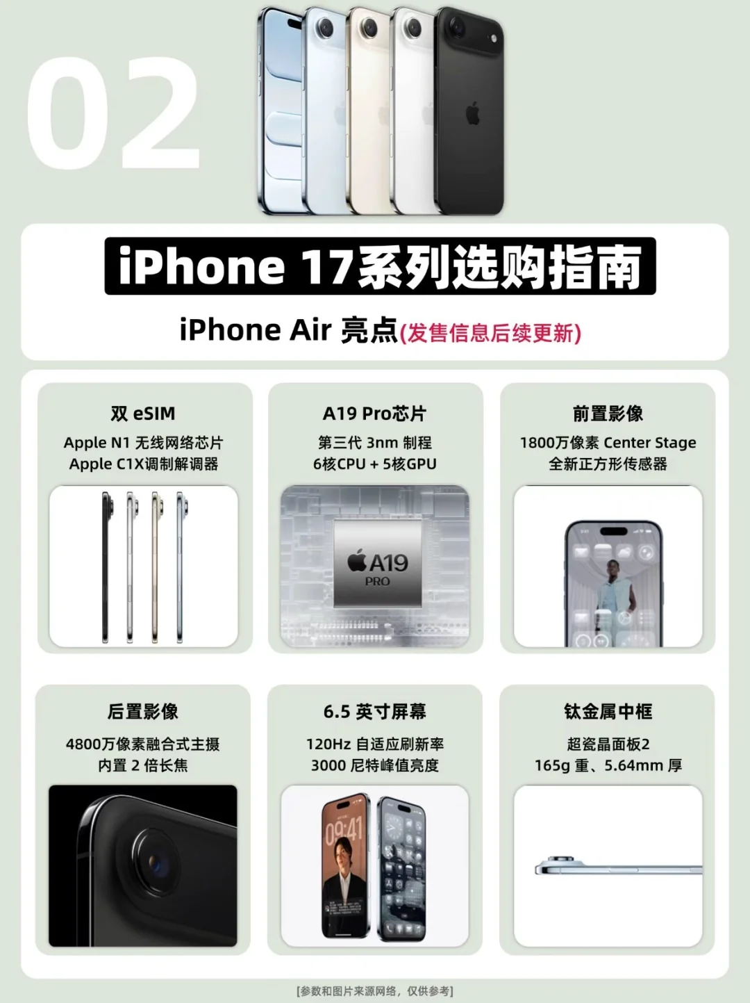 iPhone Air主打一个轻薄,且支持双eSIM卡,比较适合追求手感和eSIM的用户。另外,iPhone Air还搭载了5核GPU版的A19 Pro。但受限于其厚度等方面设计,Air续航相比其他型号要短一些,且后置只有一颗4800万像素主摄,且是单扬声器。