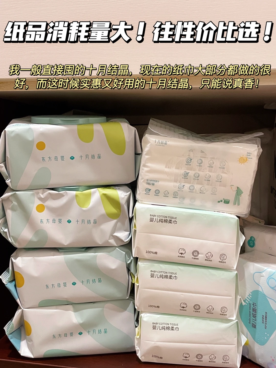 选母婴品牌的,每家差别不会特别大,主要看性价比。例如十月结晶的纸品,就属于实惠量大且好用的那种,那个小太阳云柔巾,比很多云柔巾都要柔韧,棉柔巾纯棉的,很亲肤。