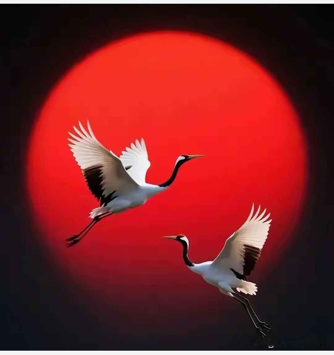 红日东升照福运, 仙鹤翩跹送吉祥。