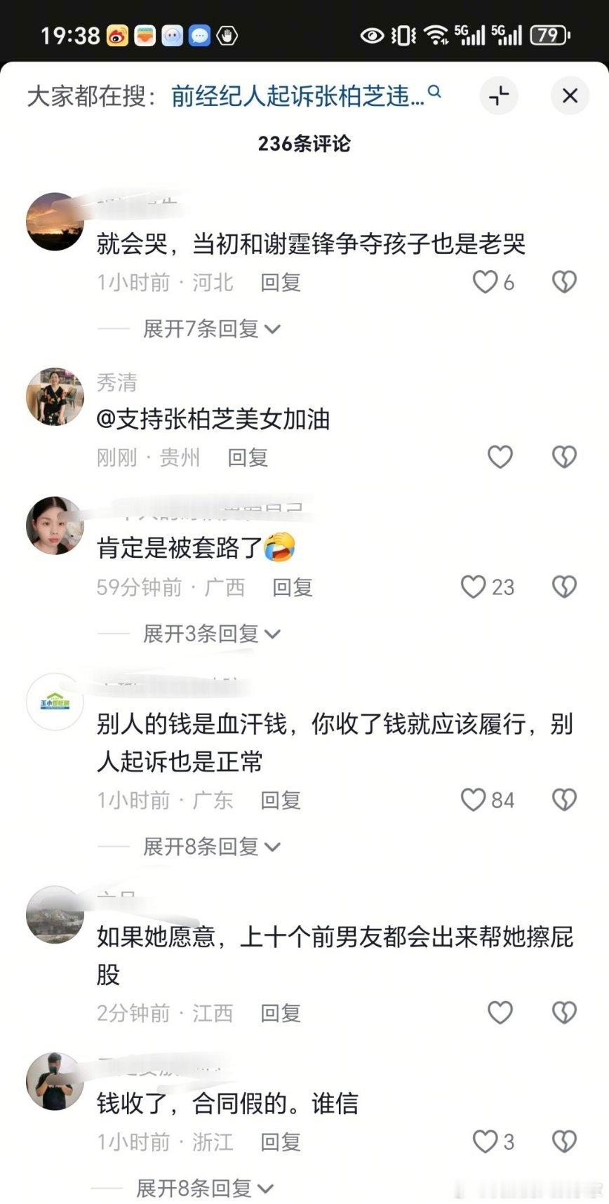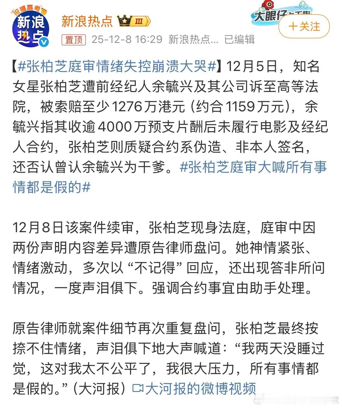 别着急喷啊,法院没判,而且她那个经纪人出了名的很爱告艺人。张柏芝多年来专注工作,《一路繁花2》里的表现大家有目共睹,这分明是被赖上了!经纪人签的合同,非本人签.名,感觉就是好友背.叛和勒.索……2013年那个公司就倒闭了,前经纪人也辞职退出,电影各个业务都全面停止了,张柏芝去哪里去拍摄不存在的电影呢?难怪张柏芝在法庭上情绪崩.溃,大喊“不公平”,大家也别着急,这案子还在审,静待真相吧!张柏芝庭审情绪失控崩溃大哭张柏芝庭审大喊所有事情都是假的