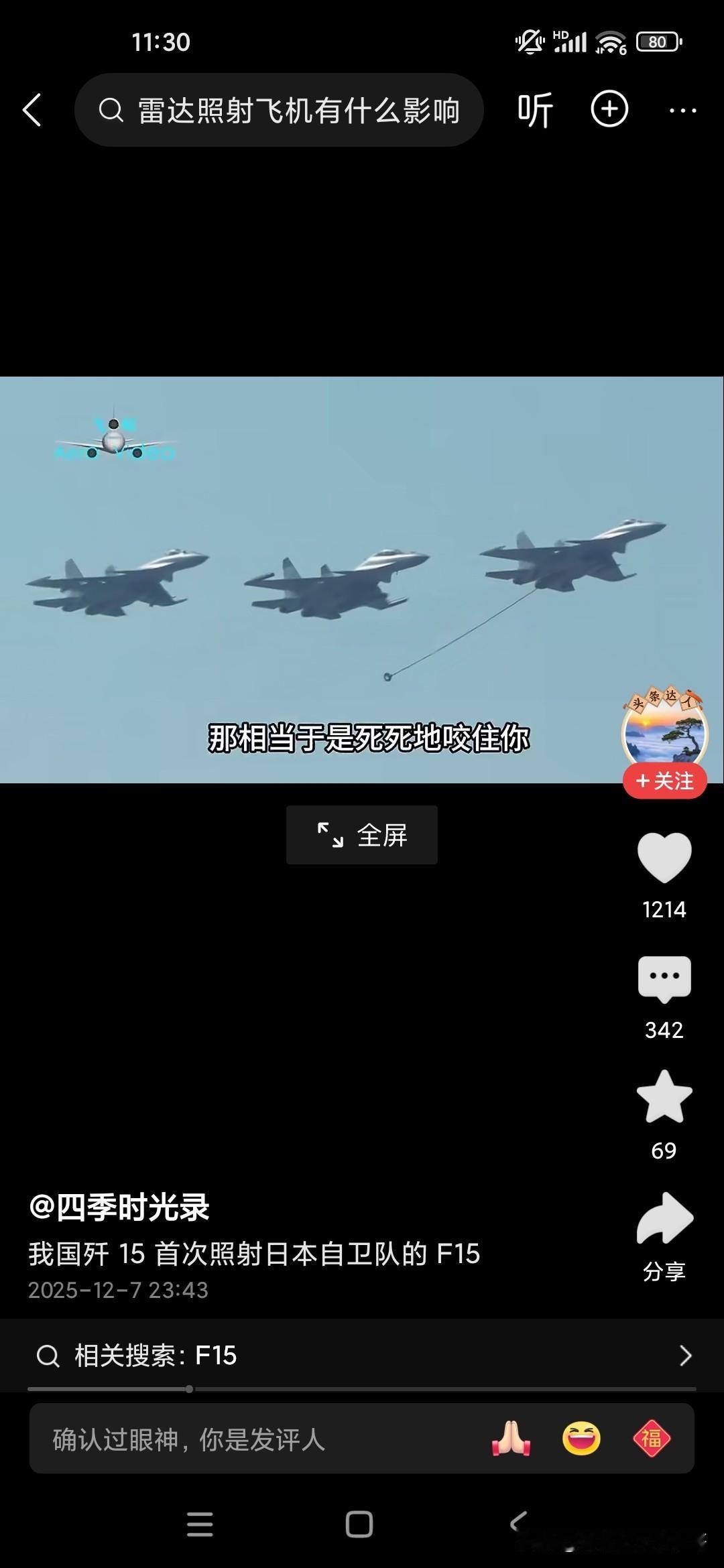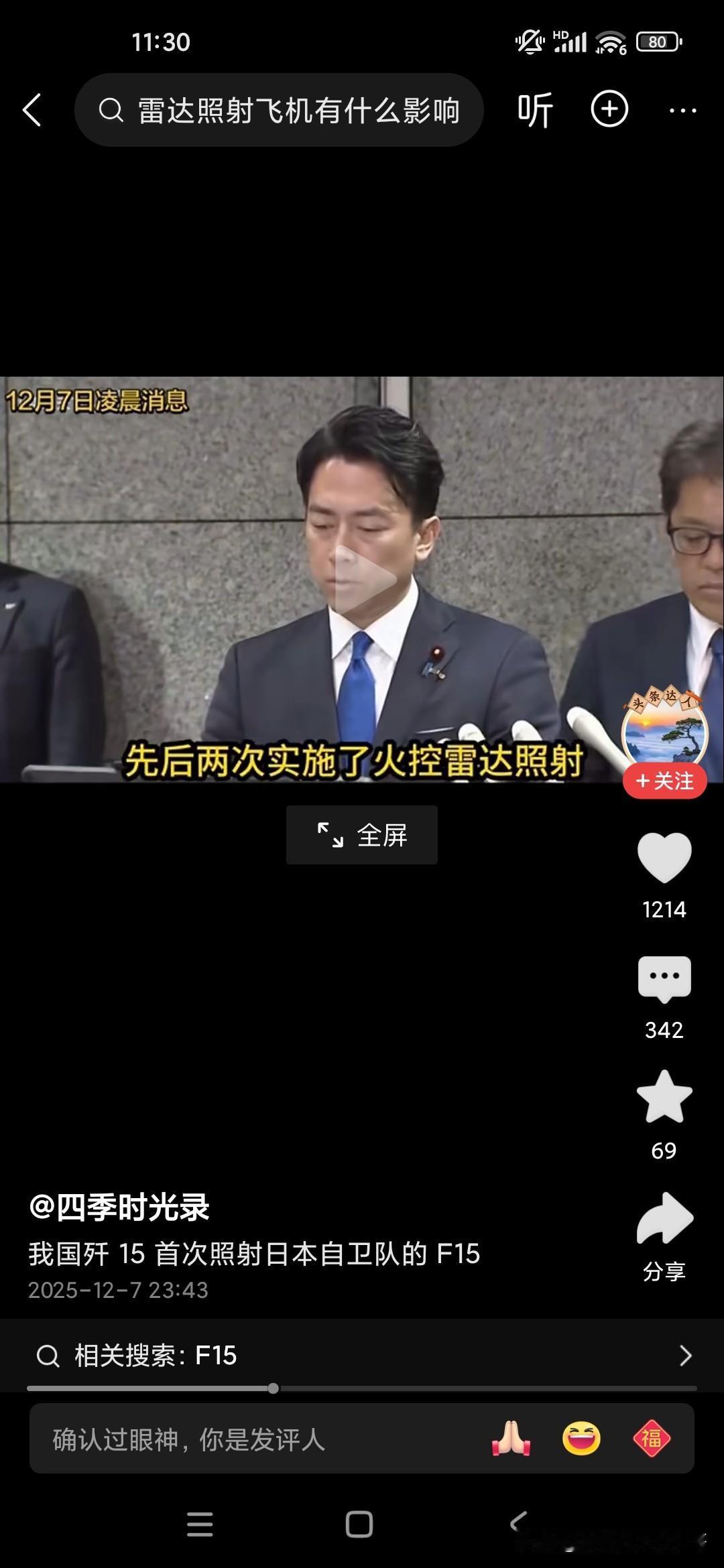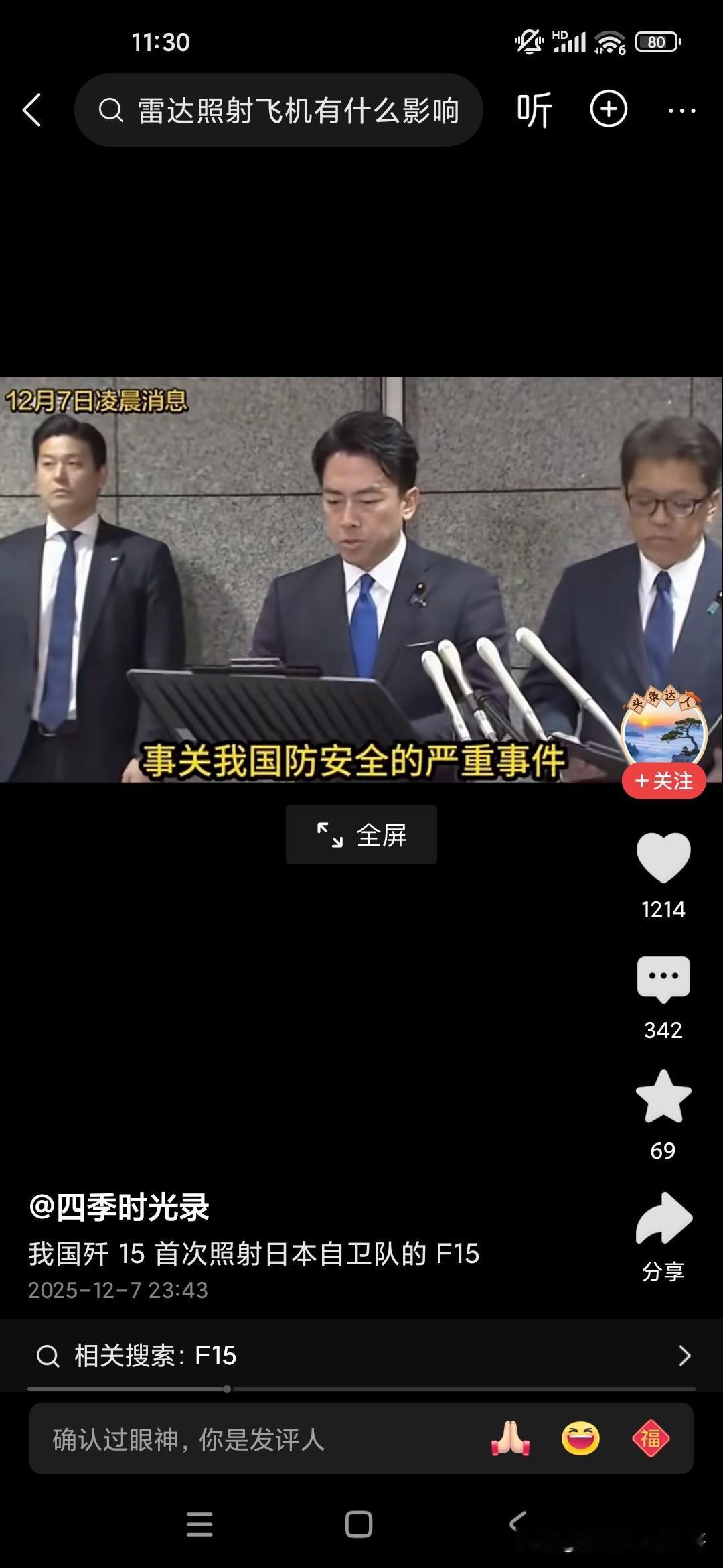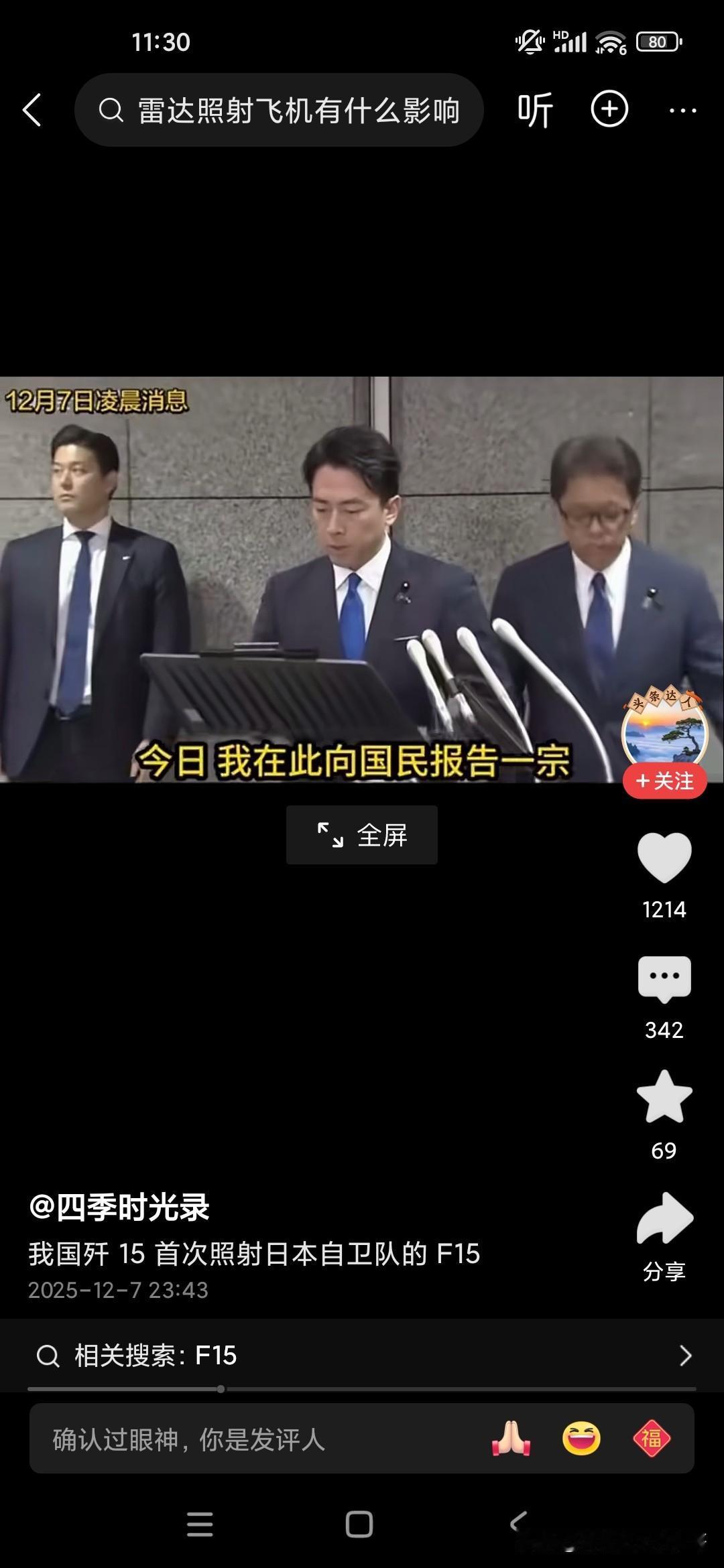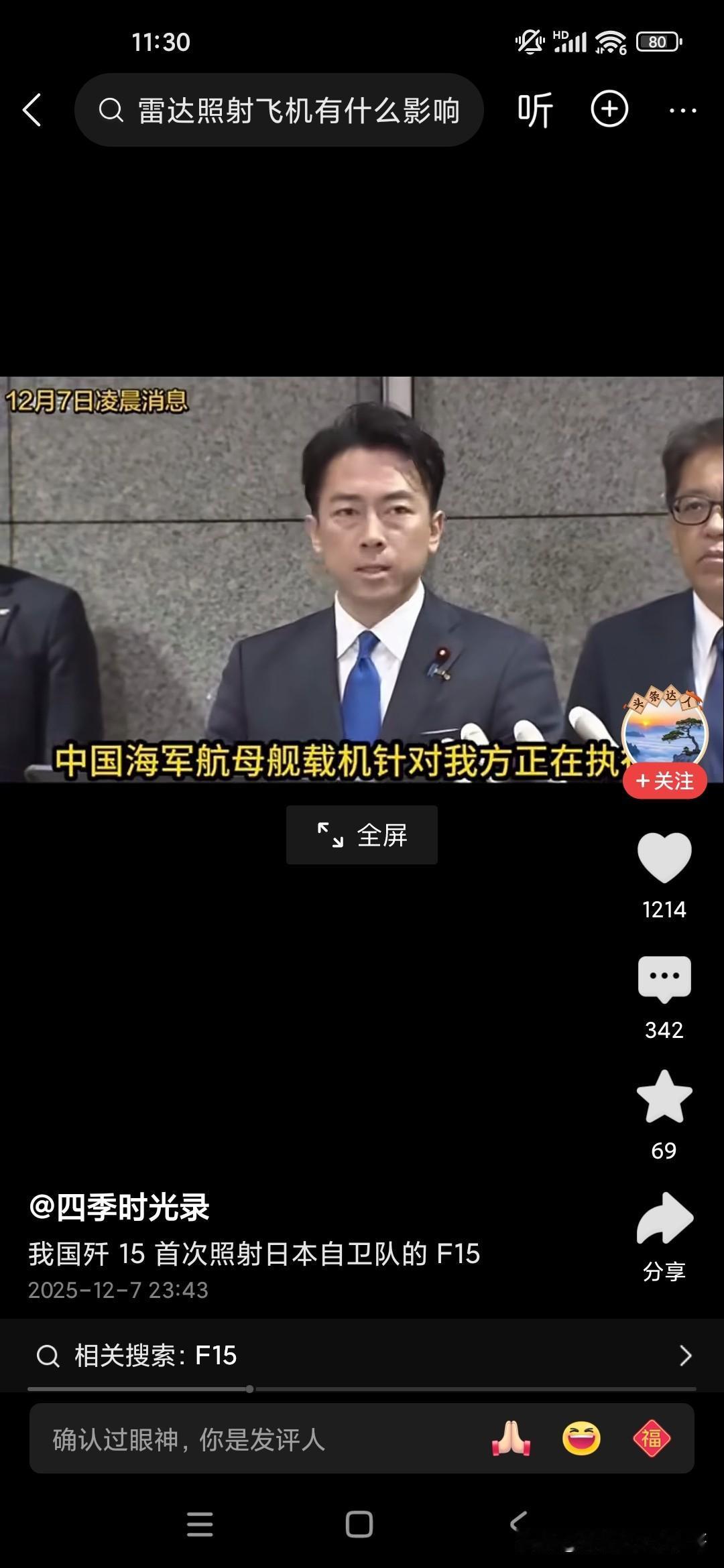我们的歼15军机锁定了日本的F15整整30分钟吧,稍微有一点军事常识的人都知道火控雷达打开的时候就是要进攻的最后一个动作了,保险已经打开,导弹已经压好了,这个空对空导弹已经弄好了,就是随时准备发射,而且雷达照射军机对飞行员的伤害也很大,所以说日本的近卫大臣防相小泉进次郎半夜2点开发布会,说明他内心非常心虚,他非常害怕中国真的打起来的话,真的招架不住,美国又不敢明确反对,虽然说有日美安保条约,但是美国不敢真正的去触中国的霉头,因为现在他自己也自身难保,特朗普又想在明年4月份访问中国,所以在这之间的话,他不想发表任何与中国国策或者说是伤害中国人民感情的事情,所以说美国啥也没说,最后小泉进次郎没有办法,只能去找澳大利亚国防部长商量一下。 大家都知道,年初的时候我们的055大驱围绕澳大利亚整整跑了两圈呀,最后放了一炮,他国防部长本来是装聋作哑的,后来实在没有办法了,说中国的军舰是在公海里边演习,跟他们没有什么关系,明眼人一看都知道了,他们只敬畏大炮,只敬畏你的军事实力,其他的他都喜欢打打嘴炮。 真希望日本人这次还是不要怂,如果他们胆敢开第一枪,嘿嘿,正好中了我们的计!