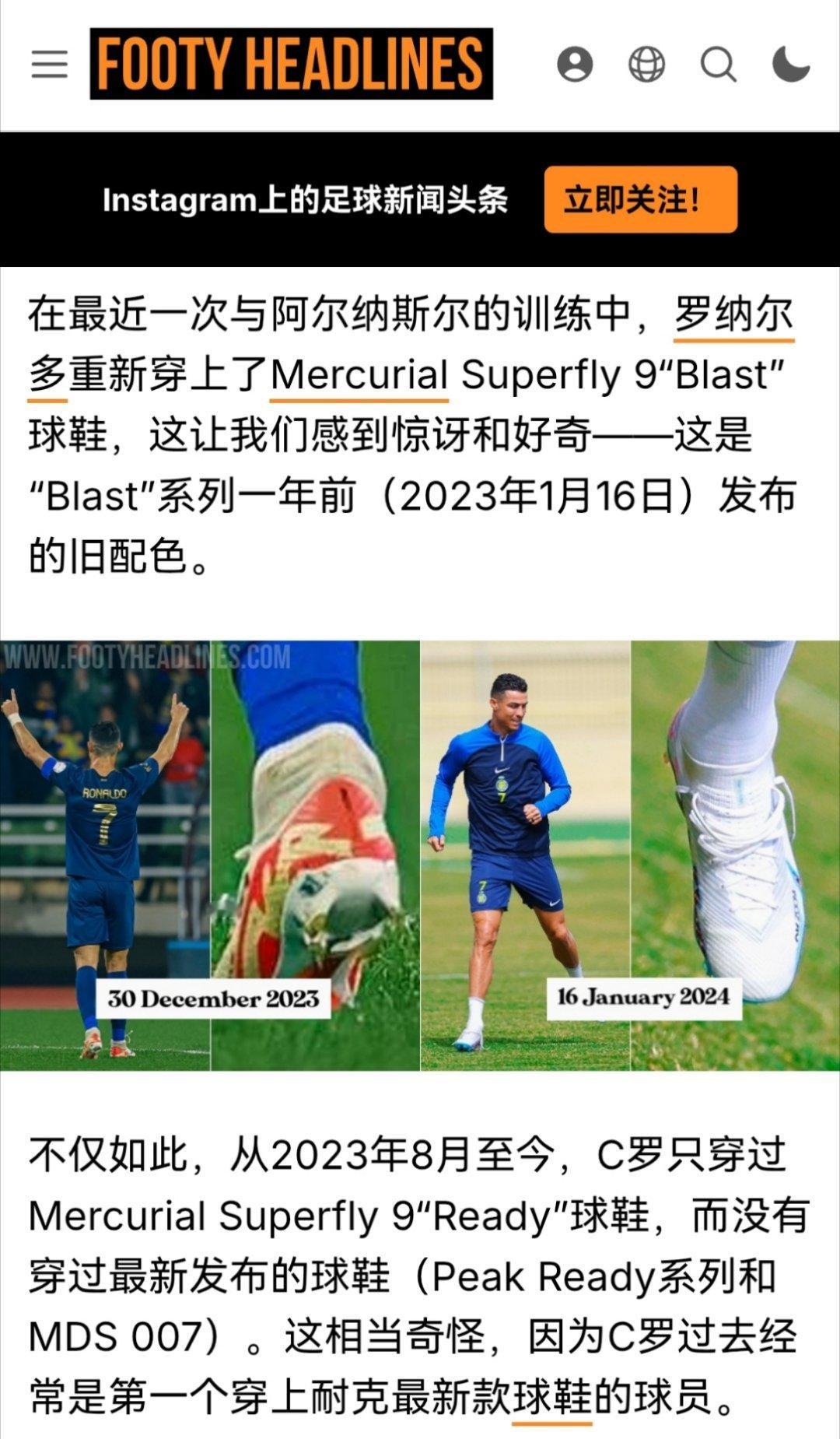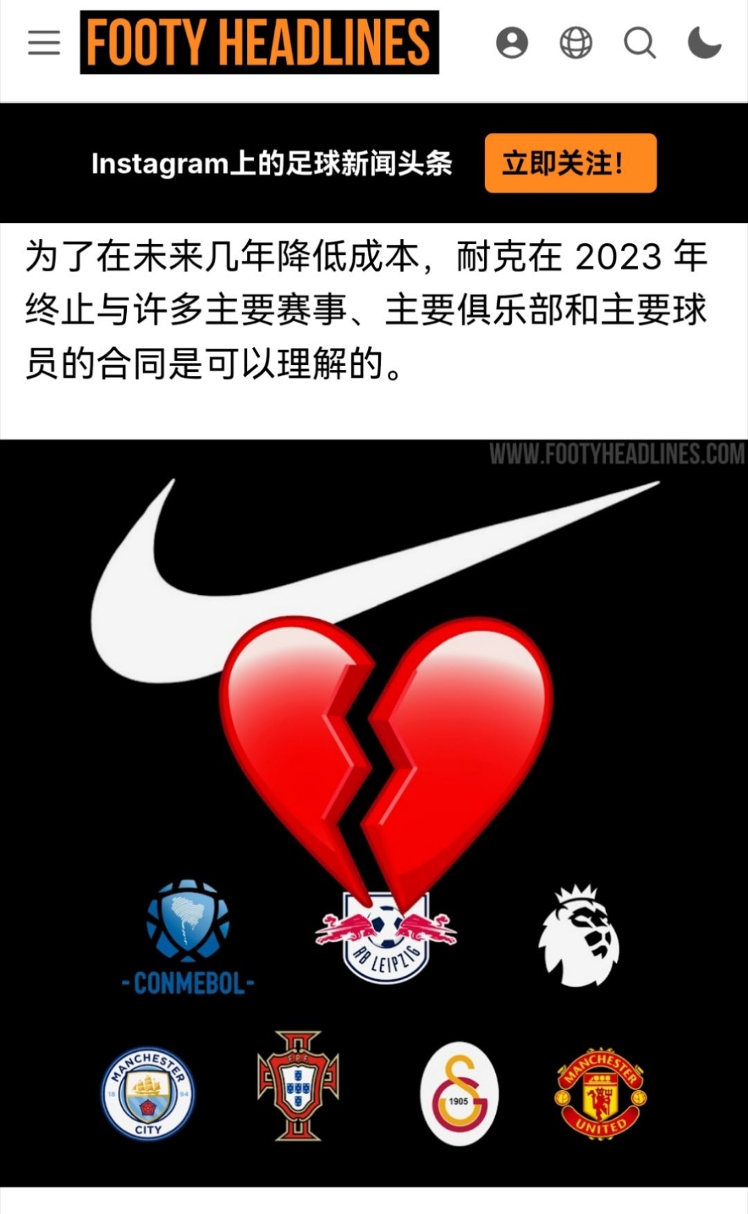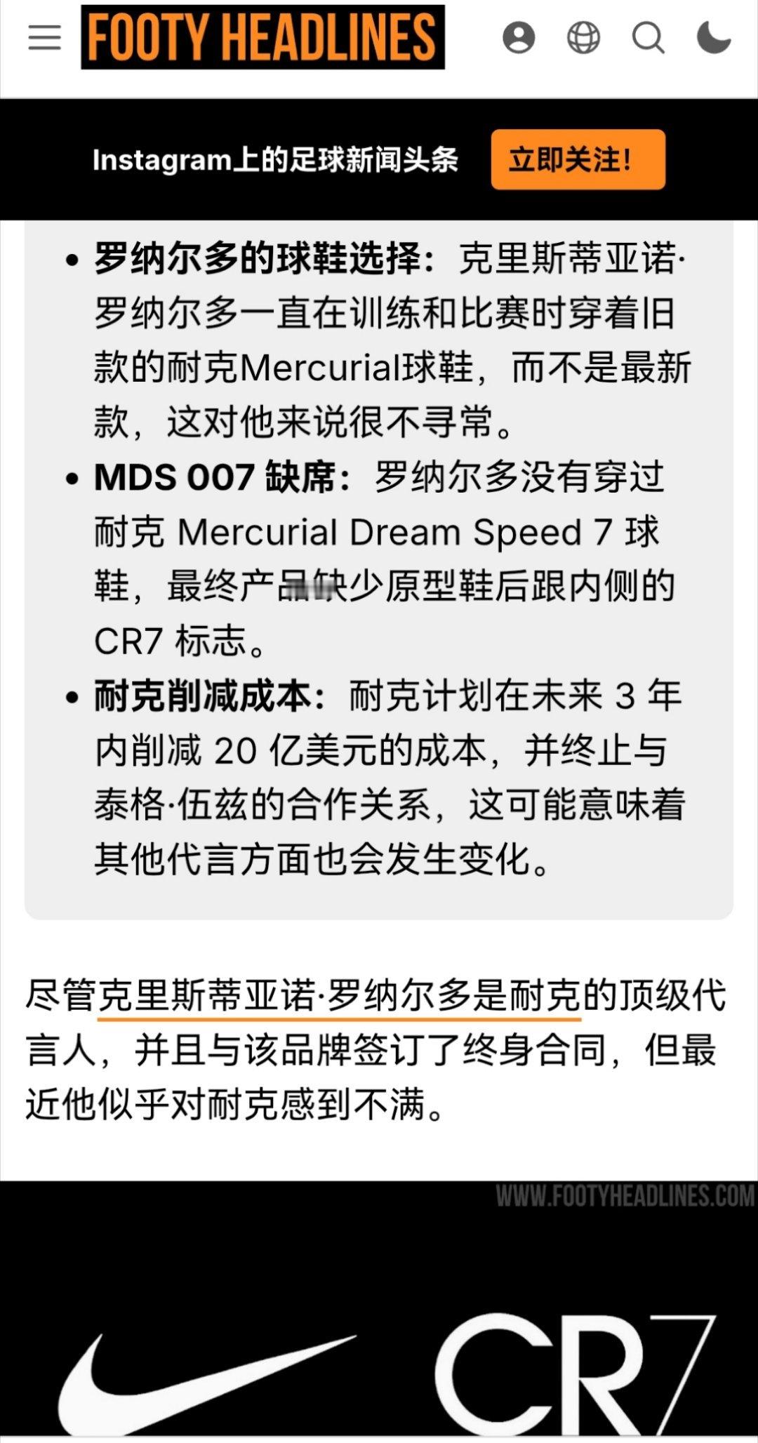 C罗 有关耐克和 C 罗的传闻其实和耐克自身战略规划有问题3 年削减 20 亿开支,大裁员终止以老虎伍兹为首等大批球星的合作关系不断取缔和男足相关领域球队以及联赛的合作说白了,耐克已经不想再玩足球了,继续姆巴佩哈兰德合作只是表明自己暂时还不会退出市场。连英超都不合作了,但是依旧没胆说官宣终止 C 罗的合作,毕竟影响力摆在这,但 C 罗退役后就不好说了,可能 C 罗转投彪马项目,也可能自己做CR7球鞋分支。