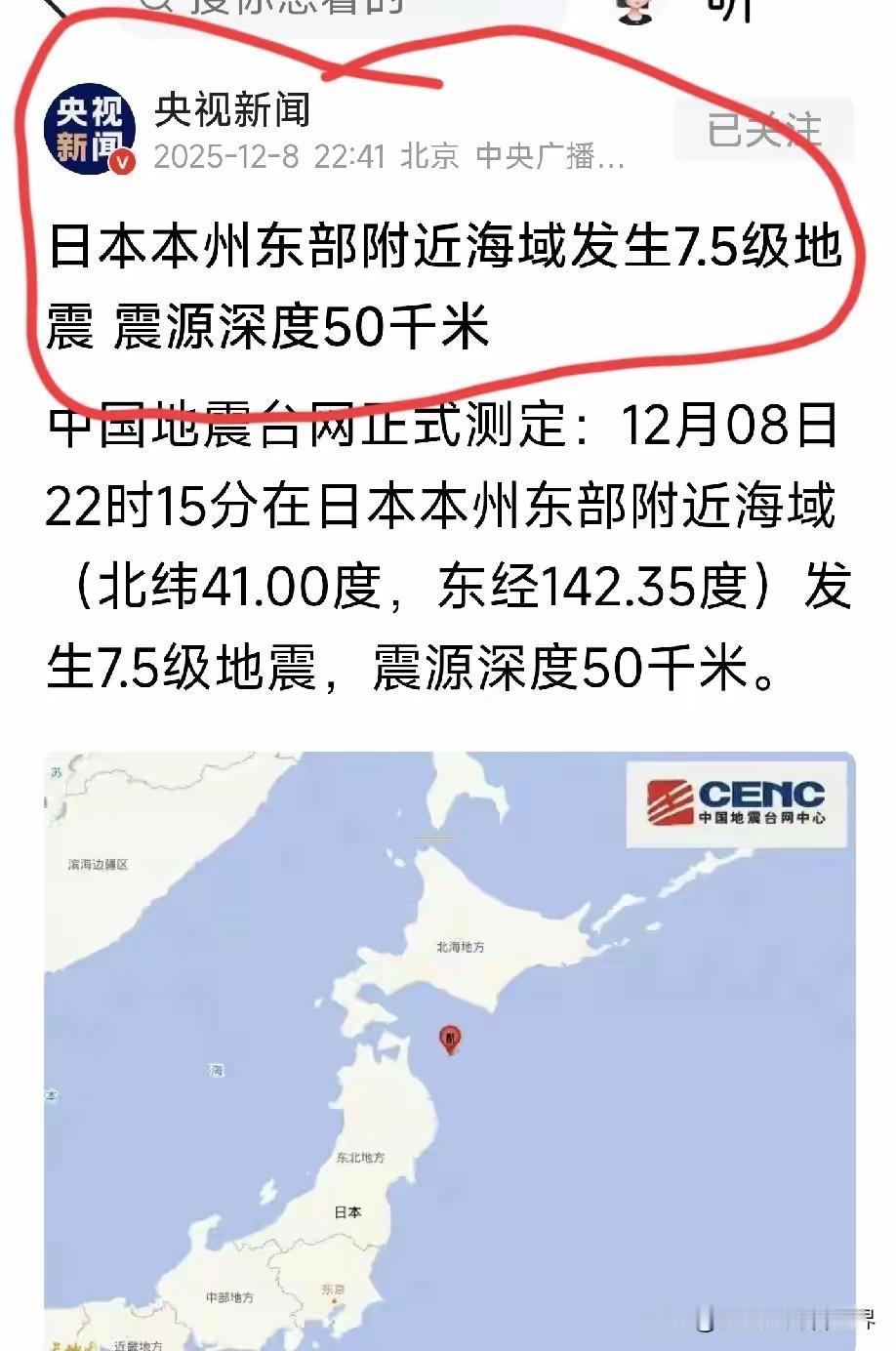 日本的天灾来得太突然、太恐怖。8日深夜,日本青森县东部附近突发两次强烈地震,部分海域或将引起最高3米海啸。据日本预测,东京直下型灾后后果严重,最坏情况或致1.8万人遇难,经济损失预计达到83亿日元。 媒体分析,日本近两月来很不太平,高市上台后,把国家内政外交搅得无法安宁,人怨不止,又生天灾,日本太不幸了。古语云,“家有作恶者,必遭天谴之”;有网友言,日本突发强震、海啸,或许是上天对现任领导者的警告,是该收敛了。日本地震海啸 但愿日本广大民众尤其是在日华人都能平安无事!
