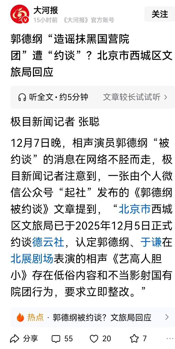 从大河报获悉,郭德纲、于谦因相声“艺高人胆小”被约谈。 其实这在意料之中,郭德纲、于谦的相声影响力颇大,其内容表面看似“离经叛道”,实则对生活刻画得细致入微、入木三分。被约谈并非坏事,这表明郭德纲、于谦的相声具有一定的“批判”意义。只是日后创作务必符合规范才行。 郭德纲