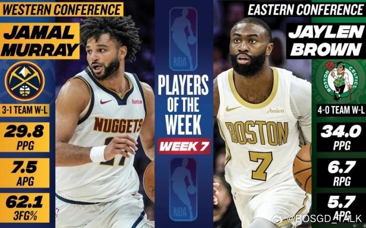🔥🔥🔥杰伦·布朗荣获周最佳上周率队取得4胜0负的战绩,场均可以得到34.0分6.7篮板5.7助攻🔥🔥🔥另外,杰伦·布朗已升至MVP榜第5名!NBA凯尔特人