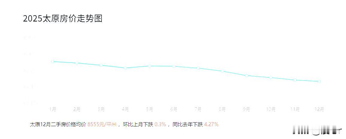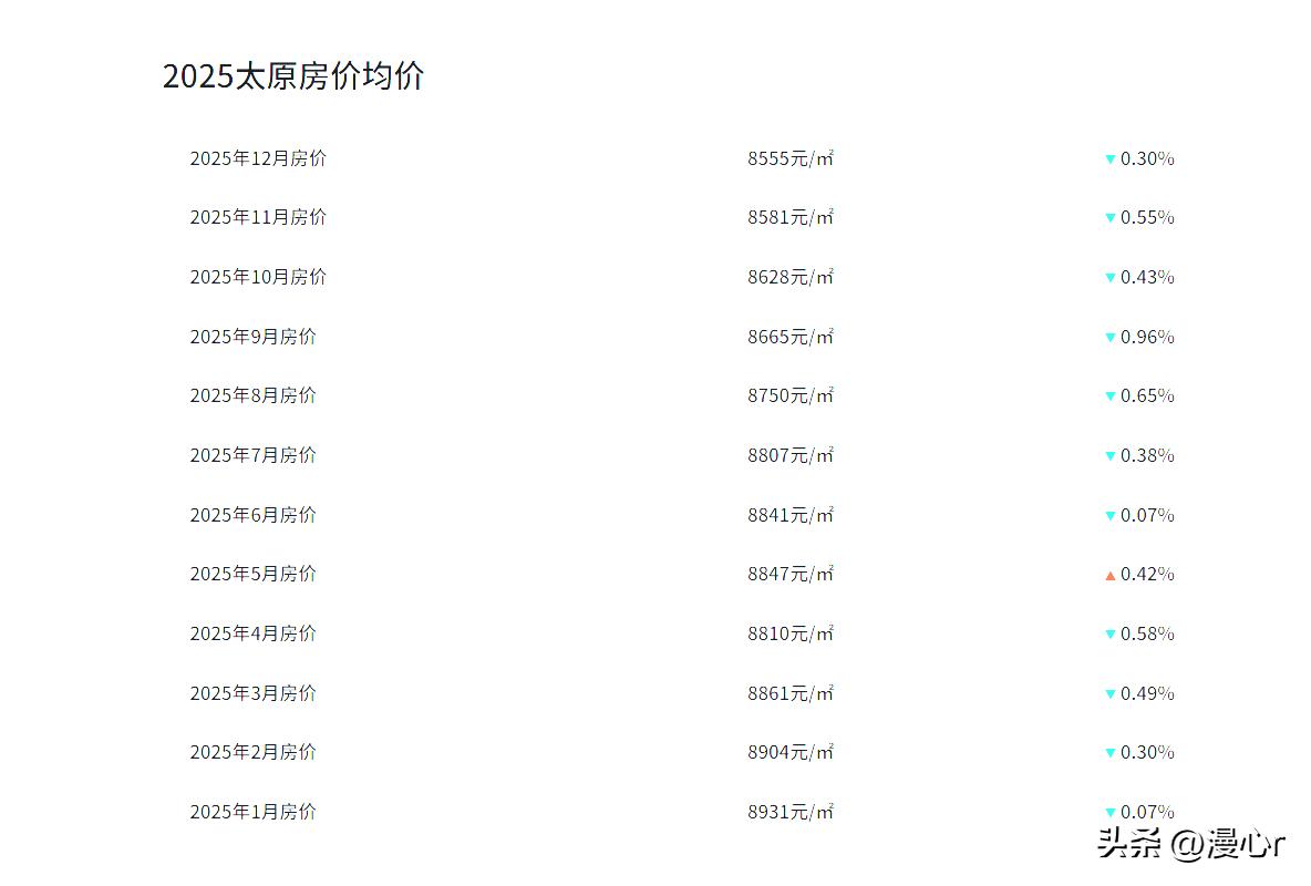 2025年1月,太原房价均价8931元; 2025年2月,太原房价均价8904元; 2025年3月,太原房价均价8861元; 2025年4月,太原房价均价8810元; 2025年5月,太原房价均价8847元; 2025年6月,太原房价均价8841元; 2025年7月,太原房价均价8807元; 2025年8月,太原房价均价8750元; 2025年9月,太原房价均价8665元; 2025年10月,太原房价均价8628元; 2025年11月,太原房价均价8581元。 2025年1月至11月,太原房价微跌350元,和太原房价最高的2018年11月的的12132元,已经下降了约3500元,平均一年下降500元。 2025年前三季度,全市GDP3816.49亿元,同比增长1.3%,比上半年加快1.0%。2024年末,全市常住人口为5514668人,比上年增加60276人,增长1.11%。 未来,太原的房价主要和经济、人口等因素成正相关,可以确定的是,一定不会出现之前的暴涨暴跌。 以上房价均价数据是参考安居客平台数据,只作为数据分析使用,实际不同区域不同地段的房子价格有显著差异。 那么对于太原的房价均价来说,大家觉得应该在哪个区间比较合适呢?