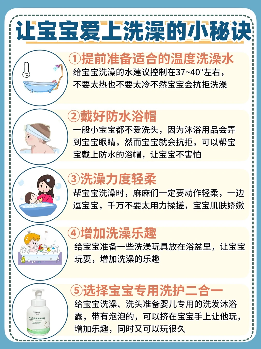✅ 提高宝宝洗澡兴趣,洗澡的时候放些轻柔的幼儿音乐或者澡盆内放几个宝宝喜欢的玩具,同时要保持洗澡间温度适宜、光线柔和,洗澡的时候可以陪宝宝短时间的互动