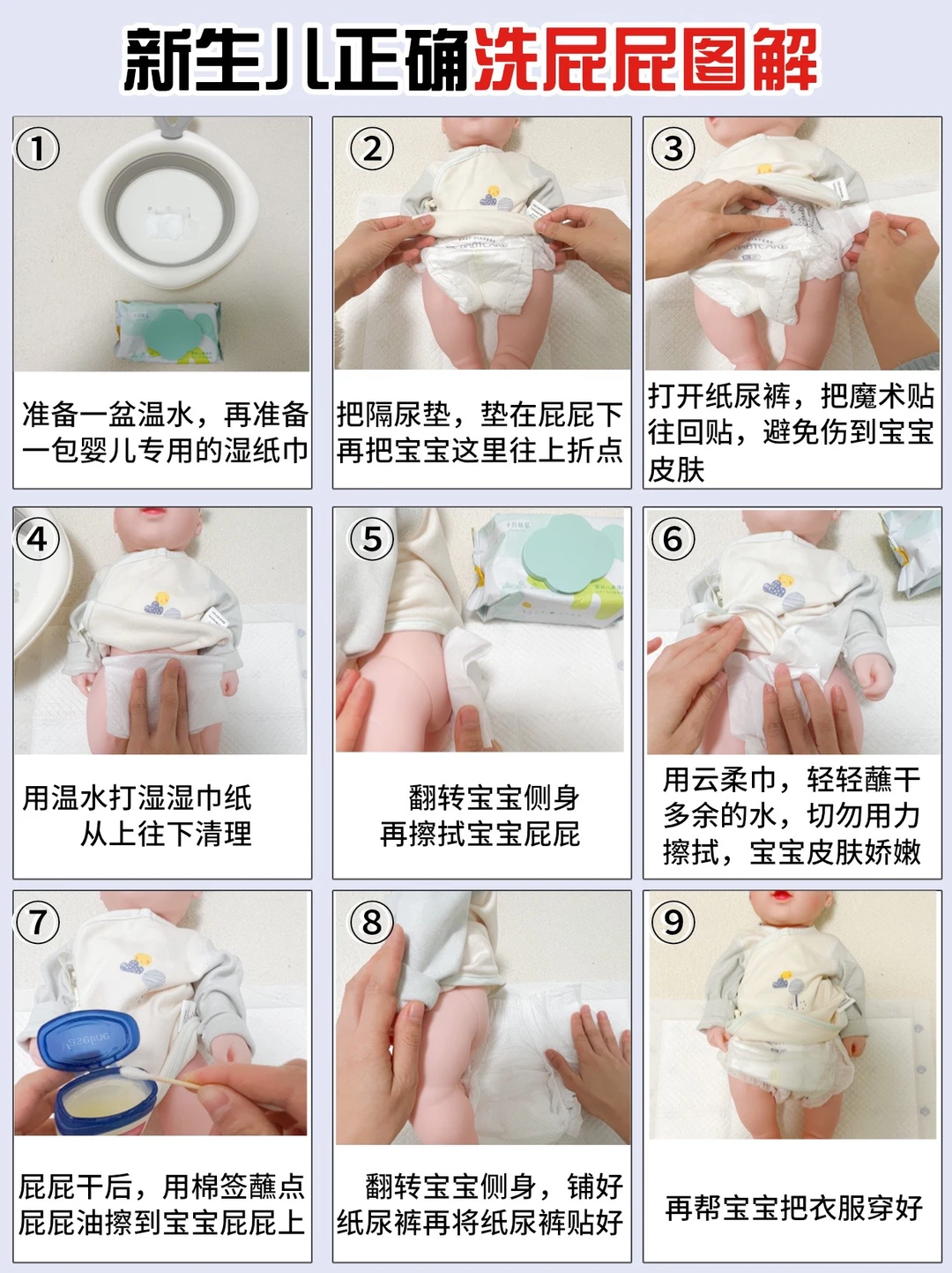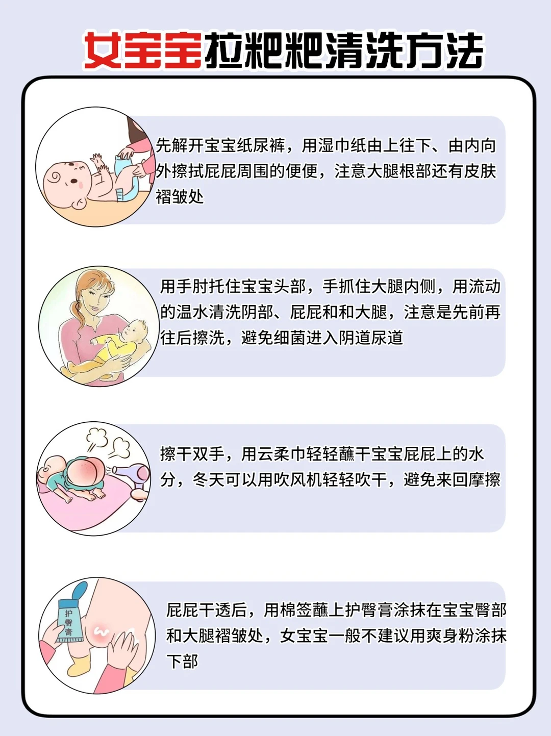 3️⃣女宝宝拉粑粑洗屁屁方法:在宝宝屁屁下垫入一次性隔尿垫,解开纸尿裤,用湿纸巾从上往下、由内向外擦拭,力度不要太大,在用流动的温水清洗,注意褶皱处与宝宝私密部位