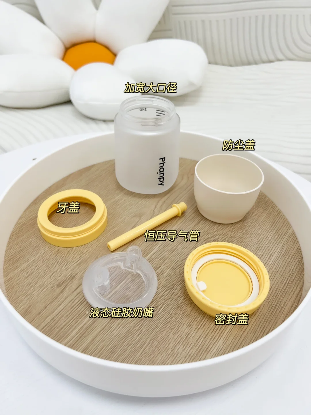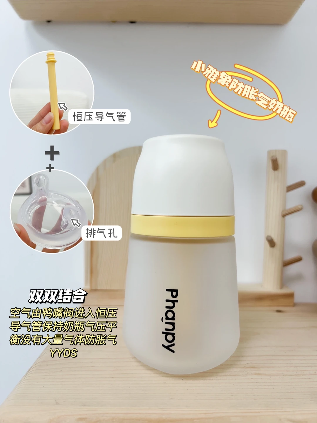 ✅✅像小雅象防胀气奶瓶,排气功能真的就很YYDS,鸭嘴阀+导气管,双双结合,恒压防胀气,空气能通过鸭嘴阀进入恒压导气管(也就是排气孔进入排气管)能保持奶瓶内外气压平衡,奶液均速低流,而且气液分离,杜绝奶液中产生气泡,没有气泡,宝宝也就不容易把空气吸到肚肚里,防止肠胀气。玻璃瓶身,外加一层磨砂硅胶,耐摔,就算从高处掉落,也不会掉渣,比普通玻璃奶瓶安全,适合多种消毒方式,高温水煮,蒸气、像平时家里的洗碗机消毒柜也是可以的,比较适合小月龄的宝宝,材质更安全