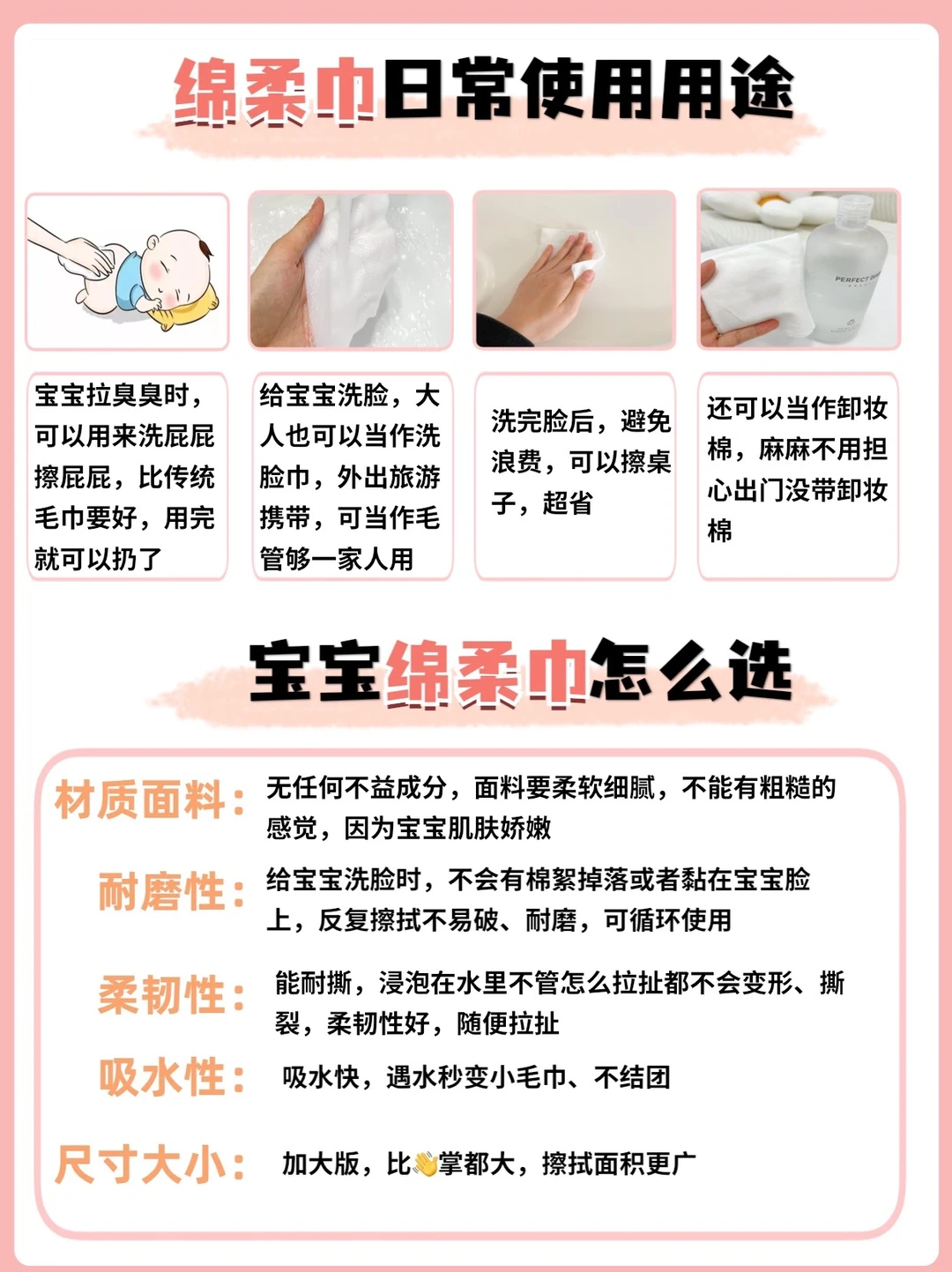 像我就对绵柔巾的需求比较多一点,因为我是个懒癌麻麻,我用完了就可以扔了,可以干湿两用,当作小毛巾