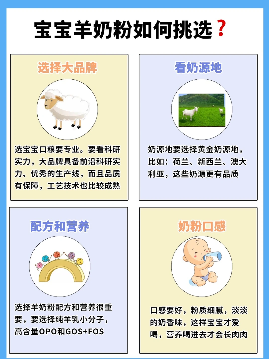 要选择像美赞臣纯冠这种全脂羊奶粉,而且还要是全段纯羊乳小分子,这样才是好羊奶!配方添加有高含量的OPO,100g含有2.8g, OPO含量是经过七大喂养效果实证,同时还有GOS+FOS双重益生元组合,可以更好的保护宝宝肠胃,不会给肚肚增添压力。
